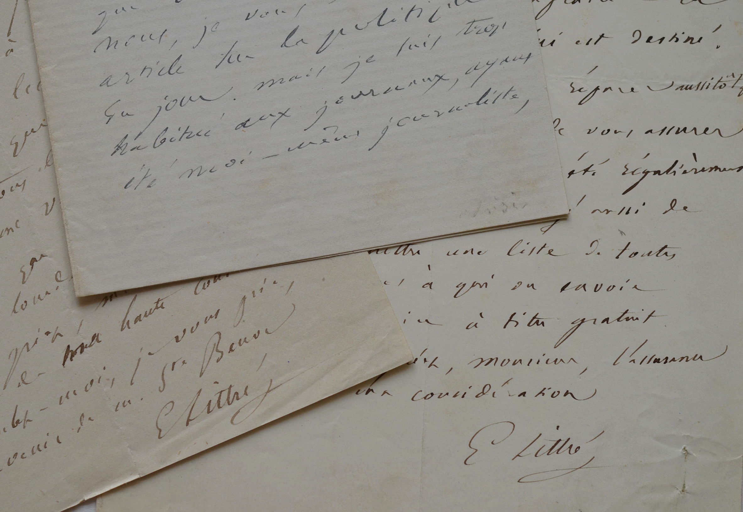 Émile Littré (Paris, 1801/1881)Emile Littré vient d'appendre qu'Alfred de Vigny, de l'Académie française, « n'a pas reçu l'exemplaire de la 4e livraison qui lui est destiné. Je vous prie de faire réparer aussi tôt que possible cette omission, et de vous assurer que tous les autres envois ont été régulièrement faits. Je vous serais obligé aussi de me transmettre une liste de toutes les personnes à qui on envoie le dictionnaire à titre gratuit. » Il oeuvre aux « addenda déjà nombreux que j'ai recueillis et travaille tous les jours. J'ai besoin qu'on me vienne en aide, car la tâche que j'ai entreprise est bien lourde. » Enfin, il soumet un article politique au Phare de la Loire : « S'il convient, mettez-le, s'il ne convient pas, écartez-le sans scrupule, cela ne me blessera en rien. »