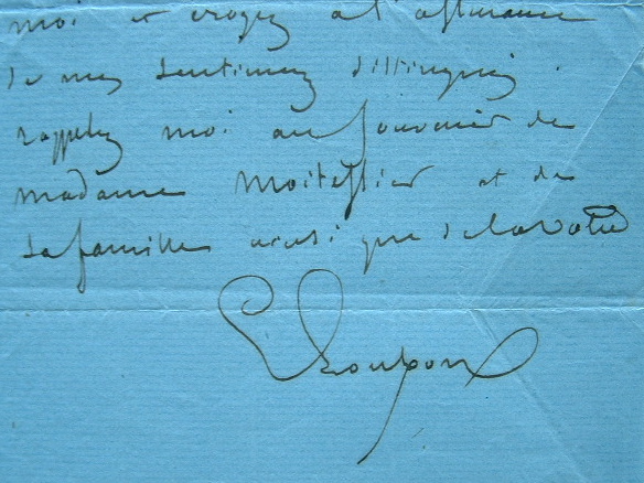 Emile Loubon (Aix-en-Provence, 1809/1863)Loubon recommande un élève qui s'est spécialisé dans la peinture sur éventail. «Cette petite industrie d'éventail pour laquelle il a déjà une certaine réputation même à Paris, mérite d'être encouragée en province. J'ai écrit dans le temps à Lyon pour qu'un de mes tableaux qui figurait à cette exposition vous fut adressé à Montpellier. Je pense qu'il doit être arrivé ; dans le cas où je ne serais pas très en règle, n'ayant pas écrit à part pour celui-là, je vous prie d'être mon protecteur auprès de la commission et de vouloir bien le recommander pour le placement [...]». Il adresse son meilleur souvenir à Mme Moitessier [qui fut immortalisée par Ingres].