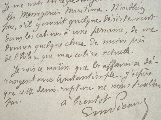 «Merci de l'envoi des études d'Evans sur Knossos ; c'est fort intéressant, il n'y manque que les petites fresques, avec les dames à crinolines et manches à gigot que nous avait montrées Potier dans sa conférence». Etant en villégiature, il donne des instructions pour obtenir des cabines à une personne et ajoute : «Je vois ce matin que les affaires se dérangent avec Constantinople. J'espère que cette demi-rupture ne nous troublera pas».
