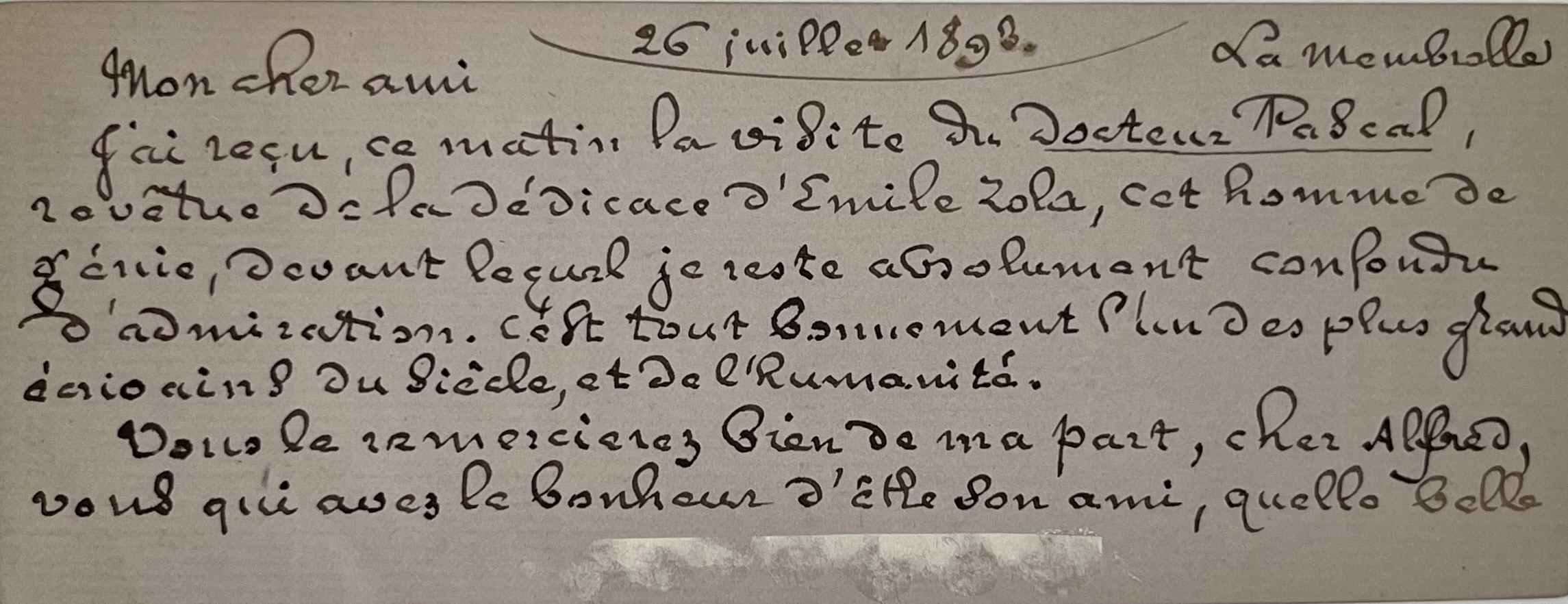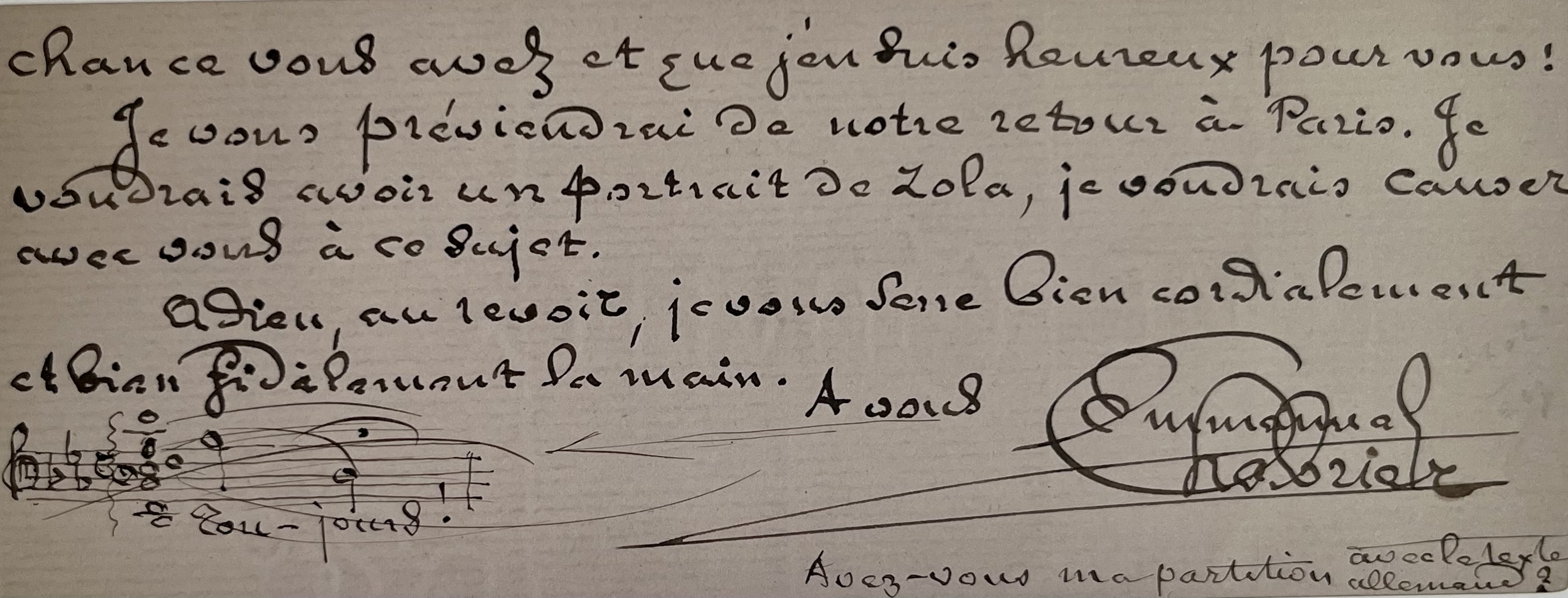 Il a reçu le matin même Le Docteur Pascal, « revêtu de la dédicace d’Émile Zola, cet homme de génie, devant lequel je reste absolument confondu d’admiration. C’est tout bonnement l’un des plus grands écrivains du siècle et de l’humanité. Vous le remercierez bien de ma part, cher Alfred, vous qui avez le bonheur d'être son ami, quelle belle chance vous avez [...]. Je voudrais avoir un portrait de Zola, je voudrais causer avec vous à ce sujet [...]". Il ajoute une petite portée de notes avec les paroles "Tou-jours". et en postscriptum : "Avez-vous ma partition avec le texte allemand ?".