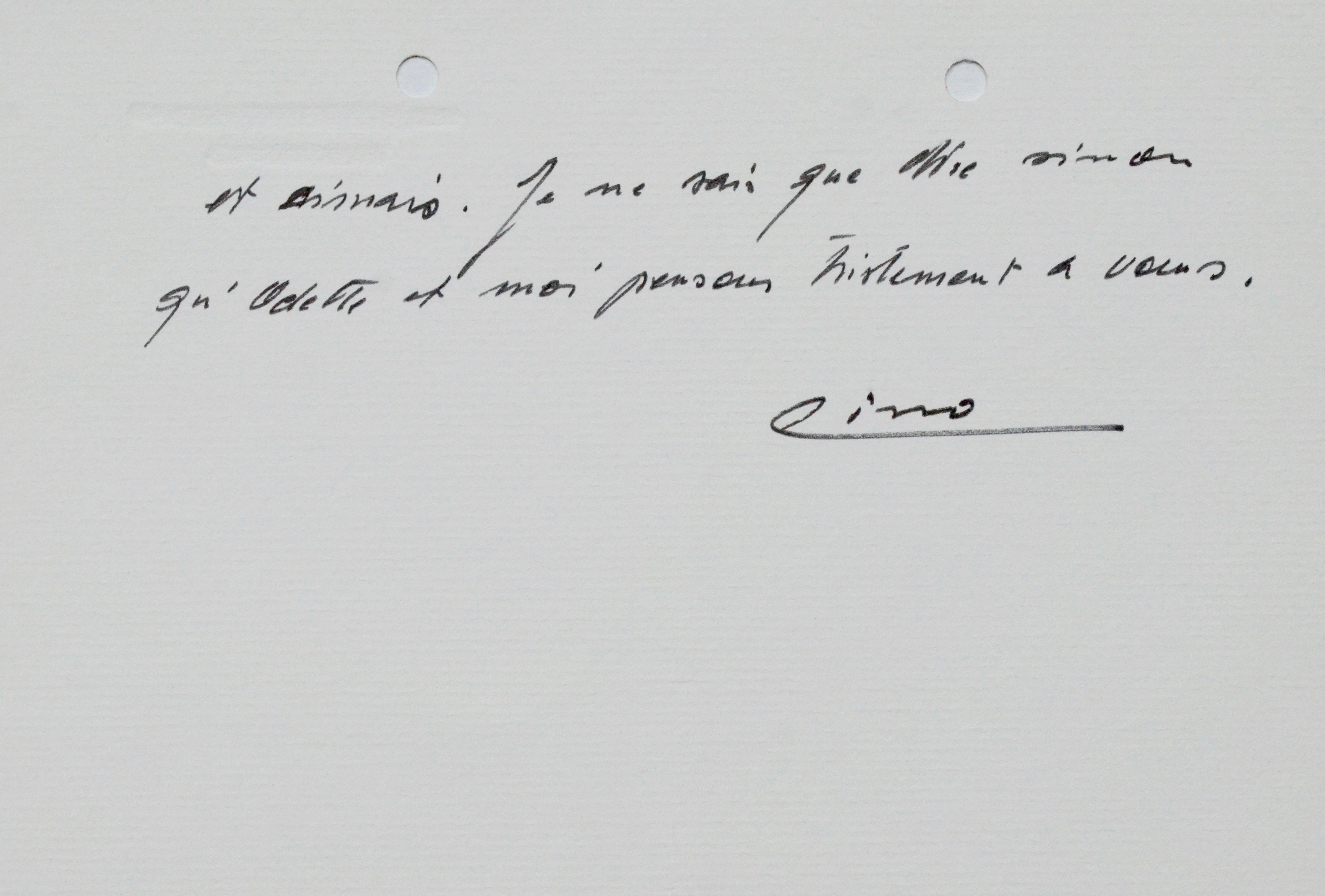 "Chère Micheline, c'est au cours de notre voyage que nous avons appris l'affreuse nouvelle. Micheline, je ne suis pas très loquace devant la mort, surtout celle de ceux que j'estimais et aimais. Je ne sais que dire sinon qu'Odette et moi pensons tristement à vous. Lino".