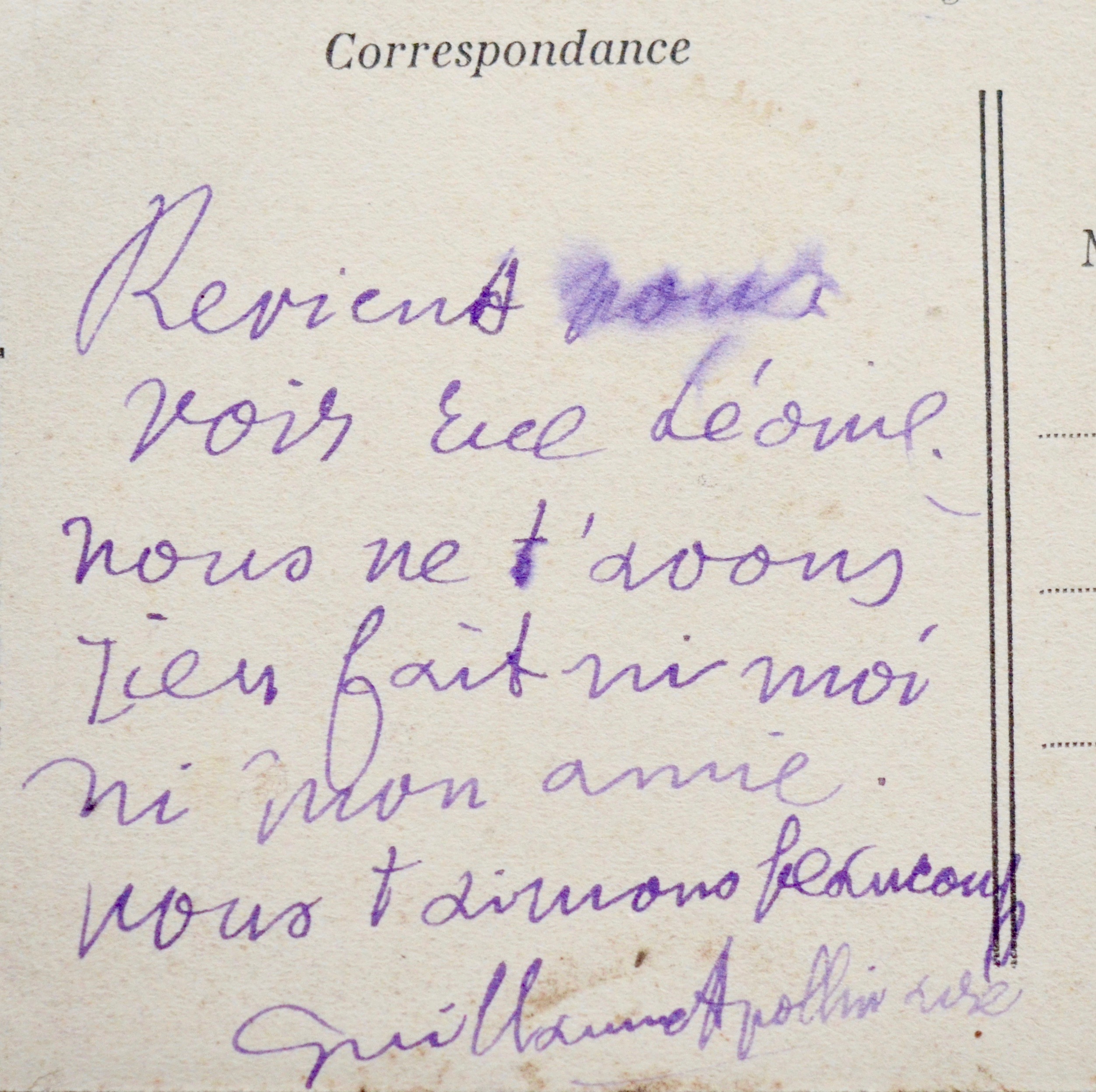« Reviens nous voir rue Léonie, nous ne t'avons rien fait, ni moi ni mon amie. Nous t'aimons beaucoup. Guillaume Apollinaire ».