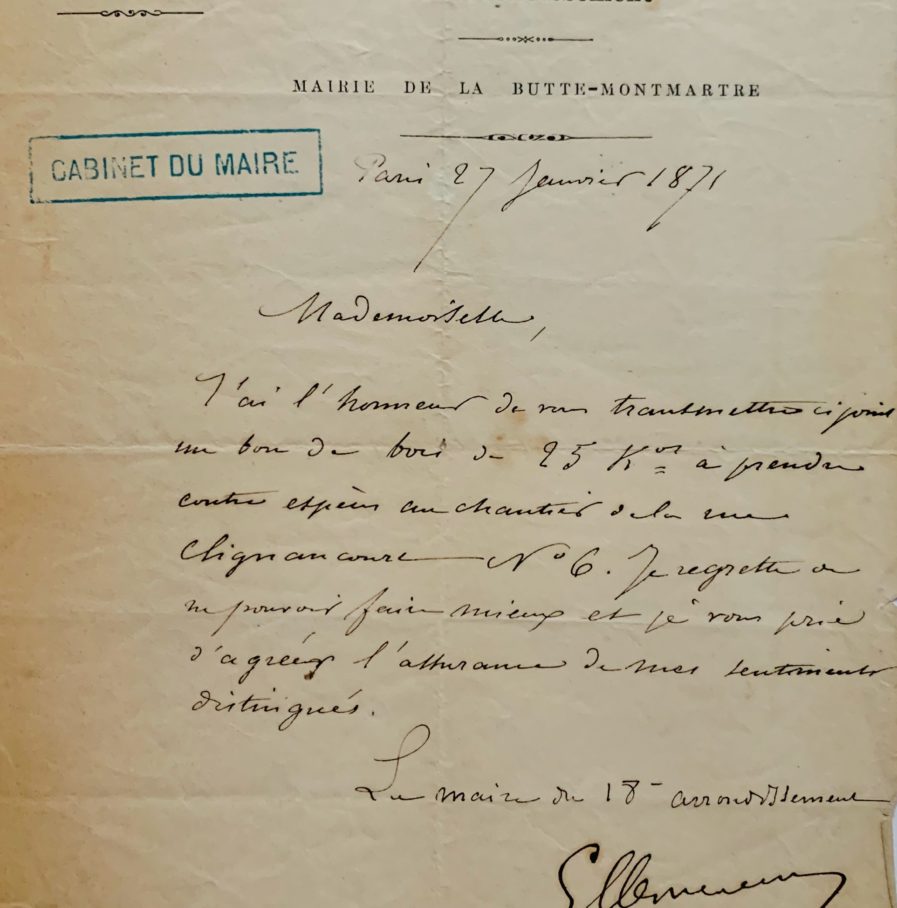 En plein siège de Paris, Clemenceau octroie du bois à une institutrice