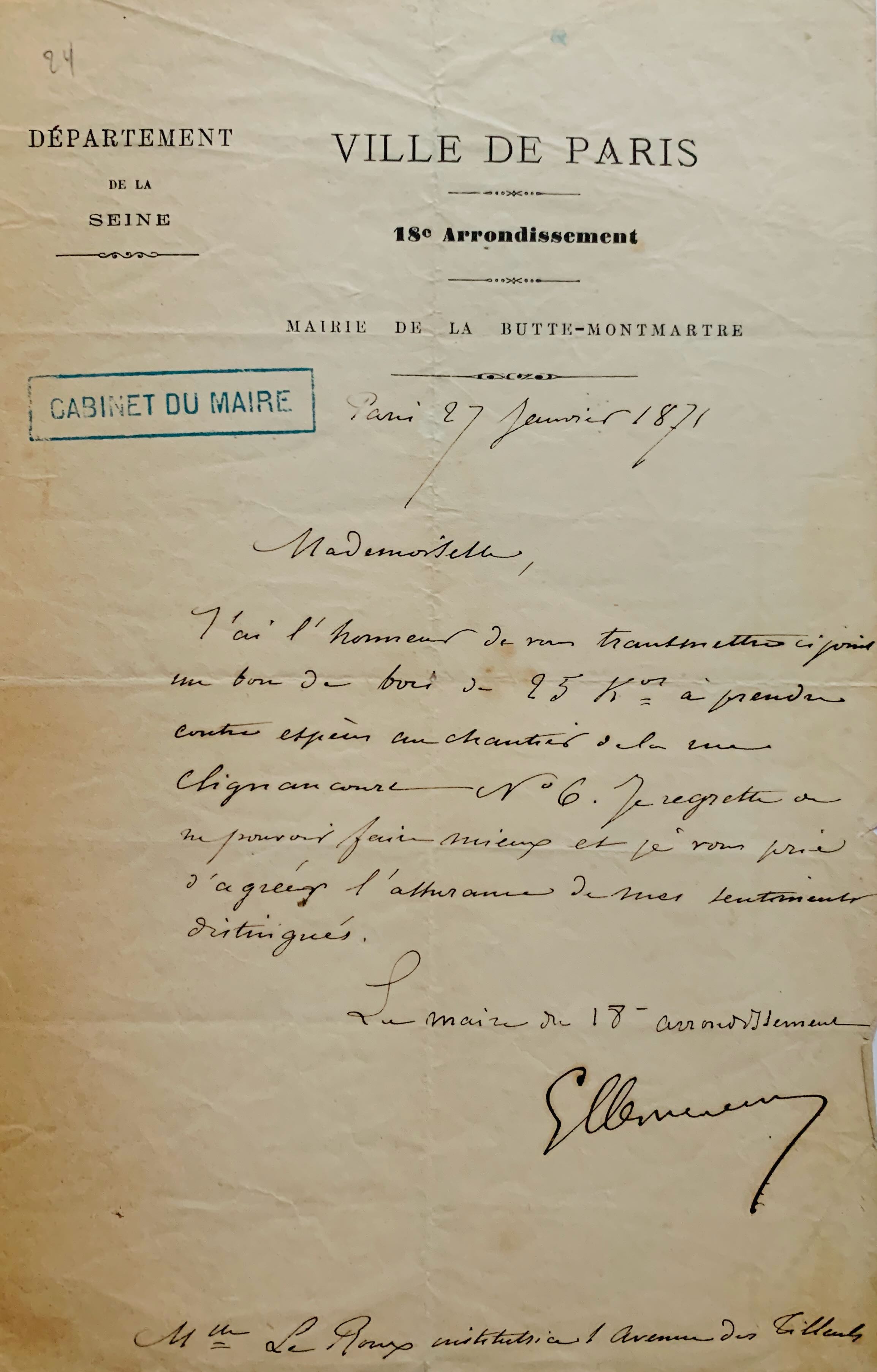 "J'ai l'honneur de vous transmettre ci-joint un bon de bois de 25 kg à prendre contre espèces au chantier de la rue de Clignancourt n°6. Je regrette de ne pouvoir faire mieux [...]".