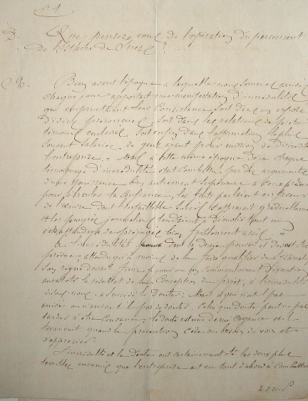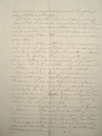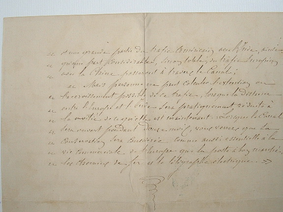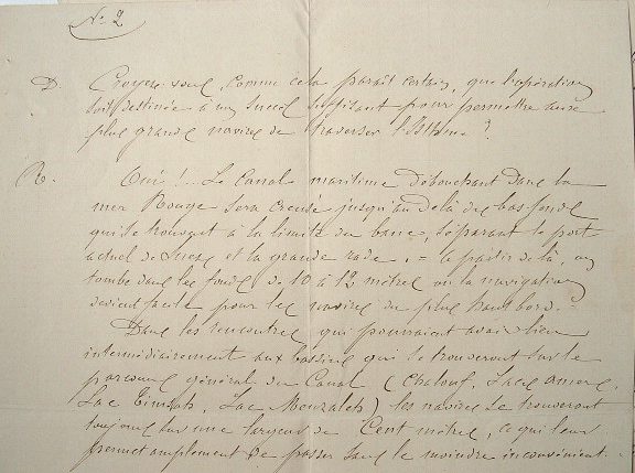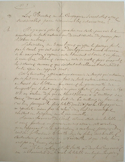 Lettre (1 p. 1/2 in-8, signature non identifiée) et un manuscrit (4 pp. in-4) sur les résultats d'une enquête menée par la Compagnie du canal de Suez, auprès de correspondants bordelais, concernant les travaux du percement de l'isthme. Trois questions sont posées : Que pensez-vous de l'opération du percement de l'isthme de Suez ? Croyez-vous, comme cela paraît certain, que l'opération soit destinée à un succès suffisant pour permettre aux plus grands navires de traverser l'isthme ? Les recettes de la Compagnie seront-elle assez considérables pour rémunérer les actionnaires ?