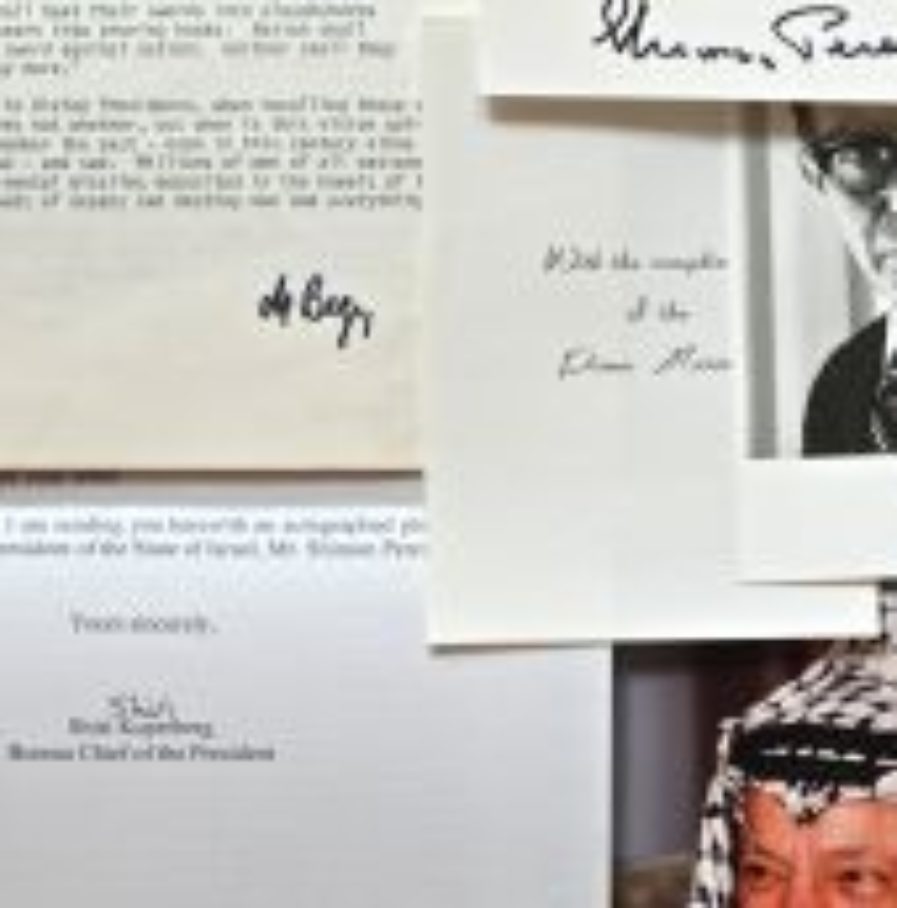 Ensemble d'autographes de personnalités israéliennes et palestiniennes (certaines possiblement signées par procédé autopened).