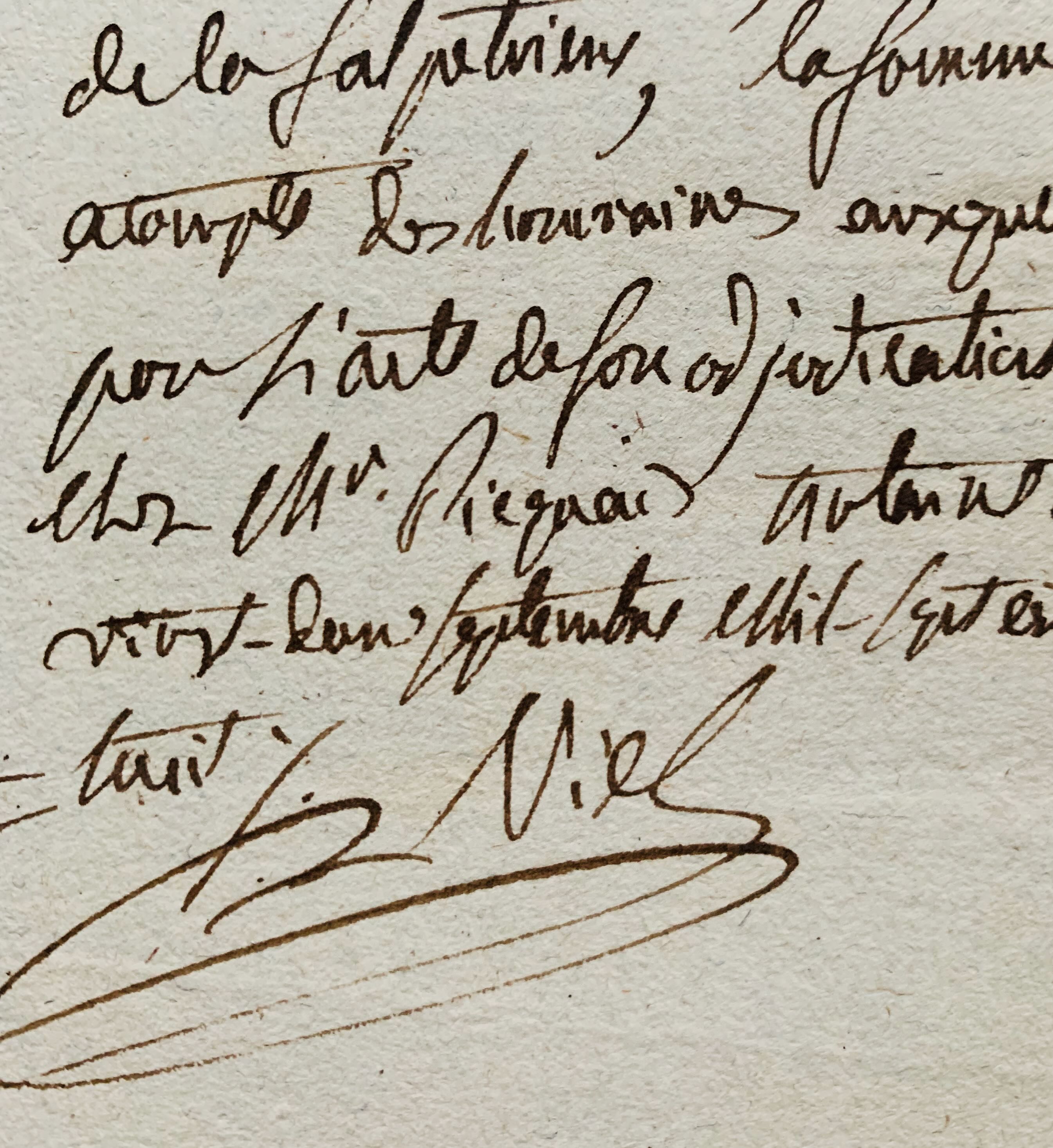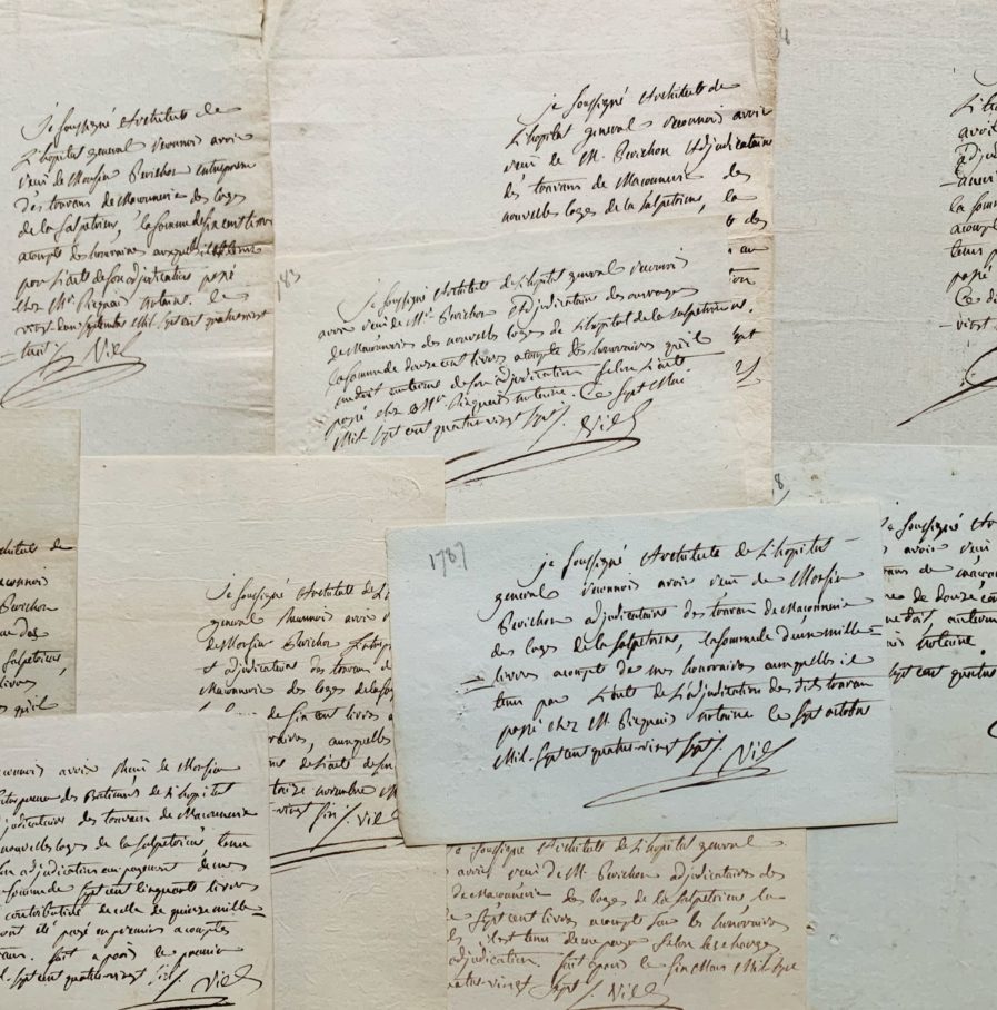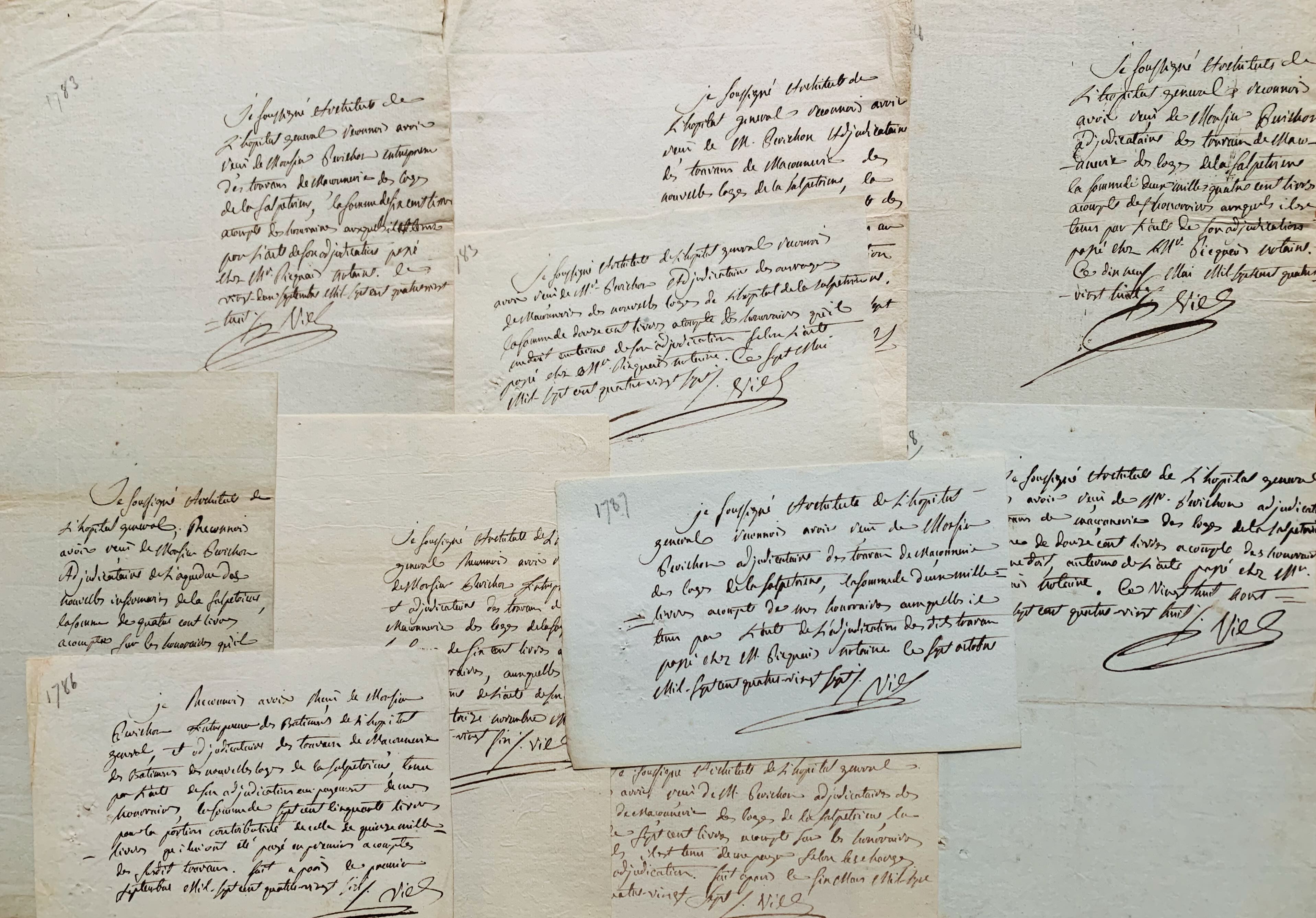 Ensemble de 10 reçus dressés par Viel, comme « architecte de l’hôpital général », à « monsieur Périchon adjudicataire des travaux de maçonnerie des loges de la Salpêtrière », pour ses honoraires. [Viel était, à cette époque, chargé de la lingerie de la Salpêtrière].