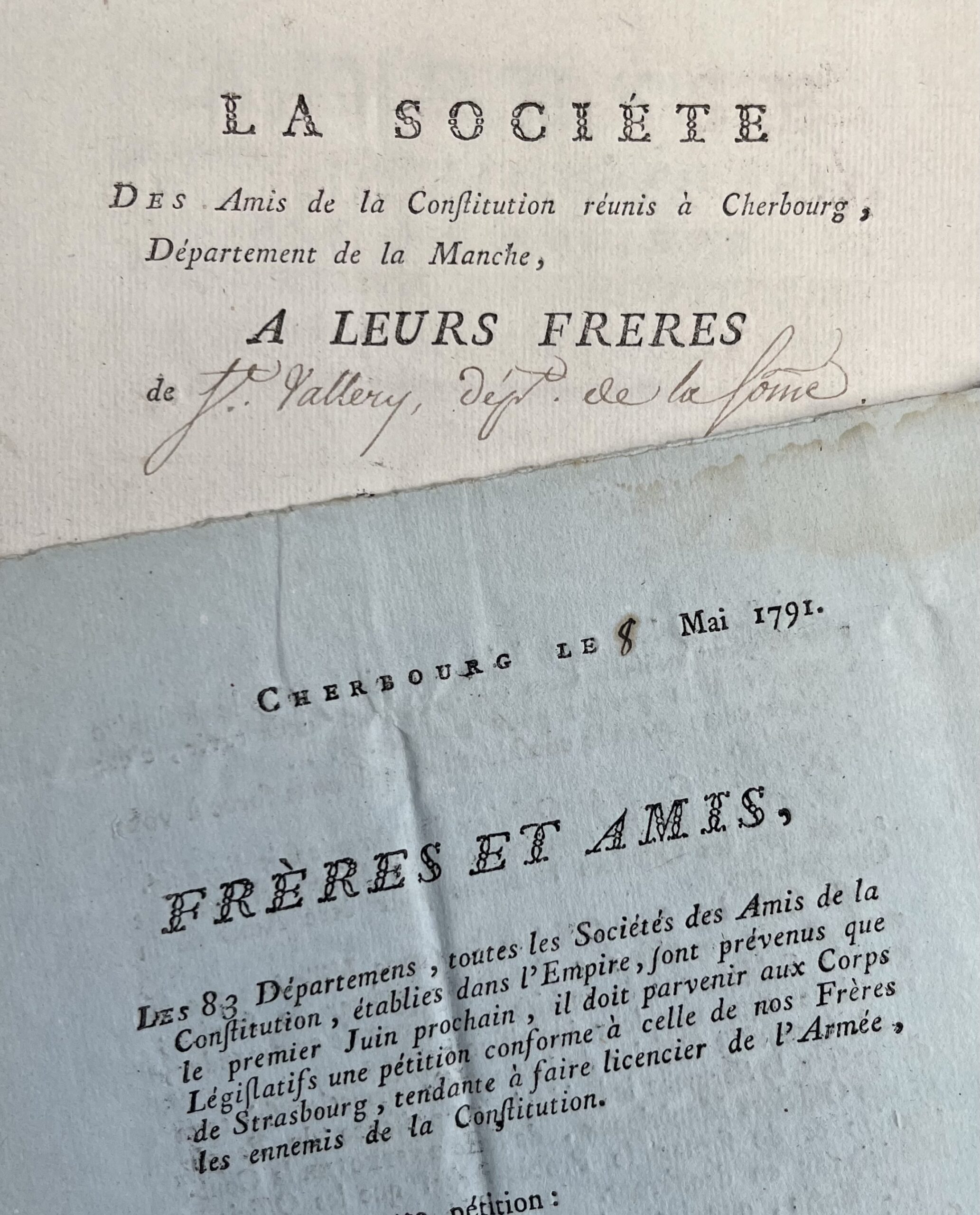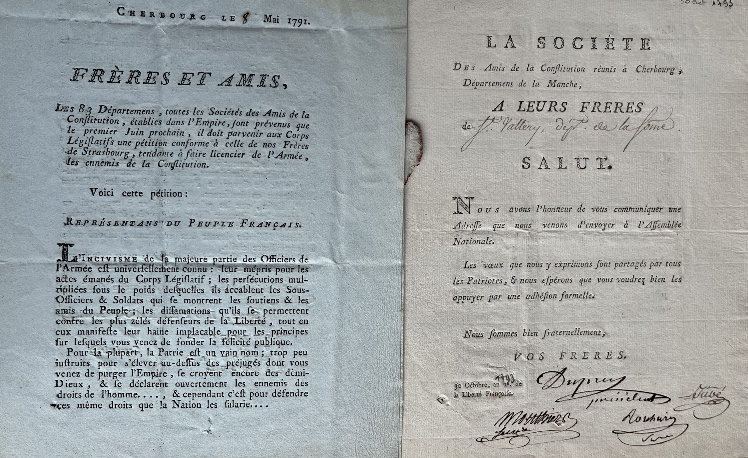- Lettre circulaire avec signatures autographes des membres de la Société des Amis de la Constitution de Cherbourg. 8 mai 1791. 3 pp. in-4. Au sujet du licenciement des officiers de l'armée. Papier bleu. cachet de cire rouge. "L'incivisme de la majeure partie des officiers de l'armée est universellement connu : leur mépris pour les actes émanas du Corps Législatif ; les persécutions multipliées sous le poids desquelles ils accablent les sous-officiers & soldats qui se montrent les soutiens & les amis du Peuple [...]. Pour la plupart la Patrie est un vain nom [...]".