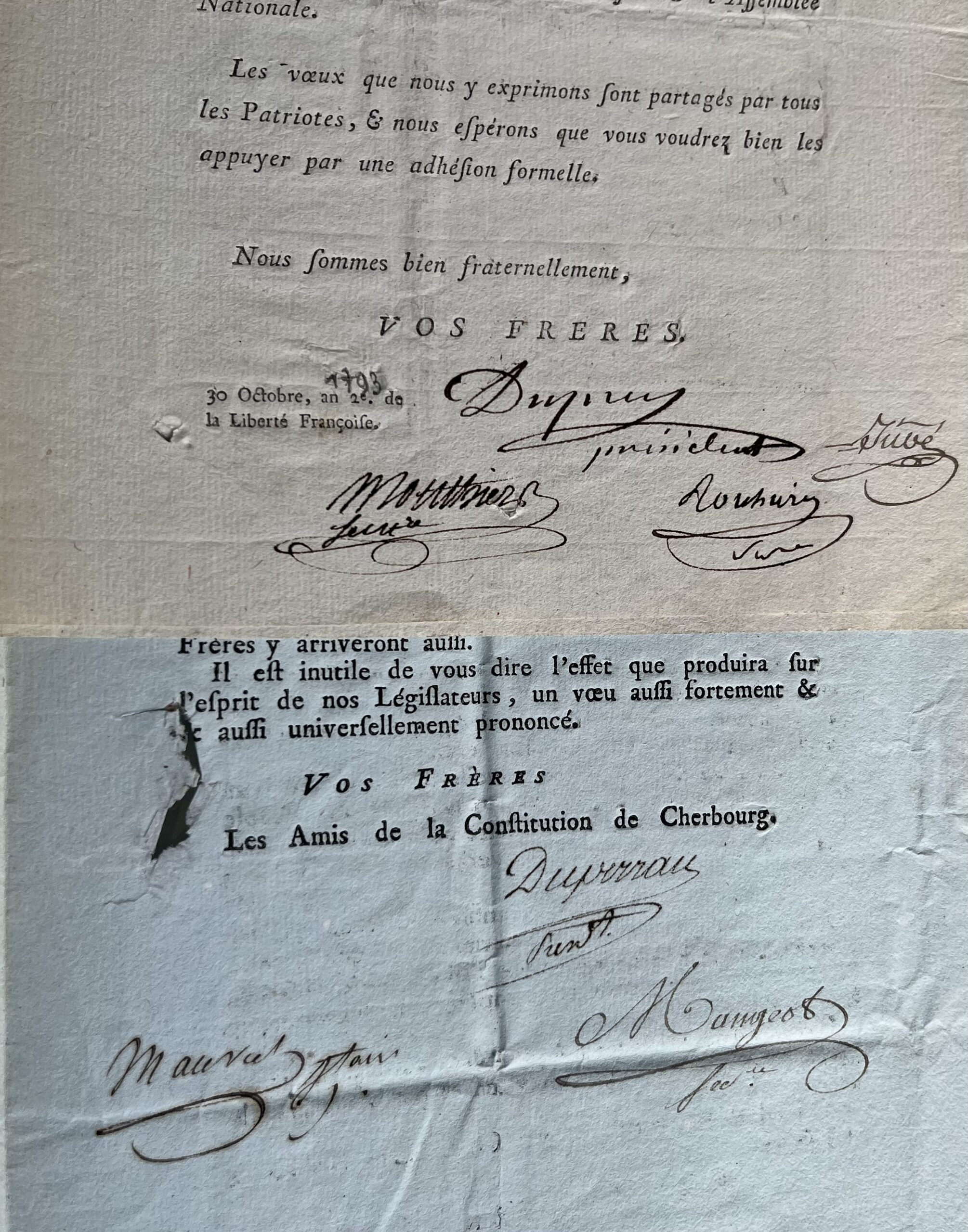 - Lettre circulaire avec signatures autographes des membres de la Société des Amis de la Constitution de Cherbourg. 30 octobre 1793. 1 p. in-4. Ils les informent d'une adresse qu'ils viennent d'envoyer à l'Assemblée Nationale. "Les voeux que nous y exprimons sont partagés par tous les Patriotes & nous espérons que vous voudrez bien les appuyer par une adhésion formelle".