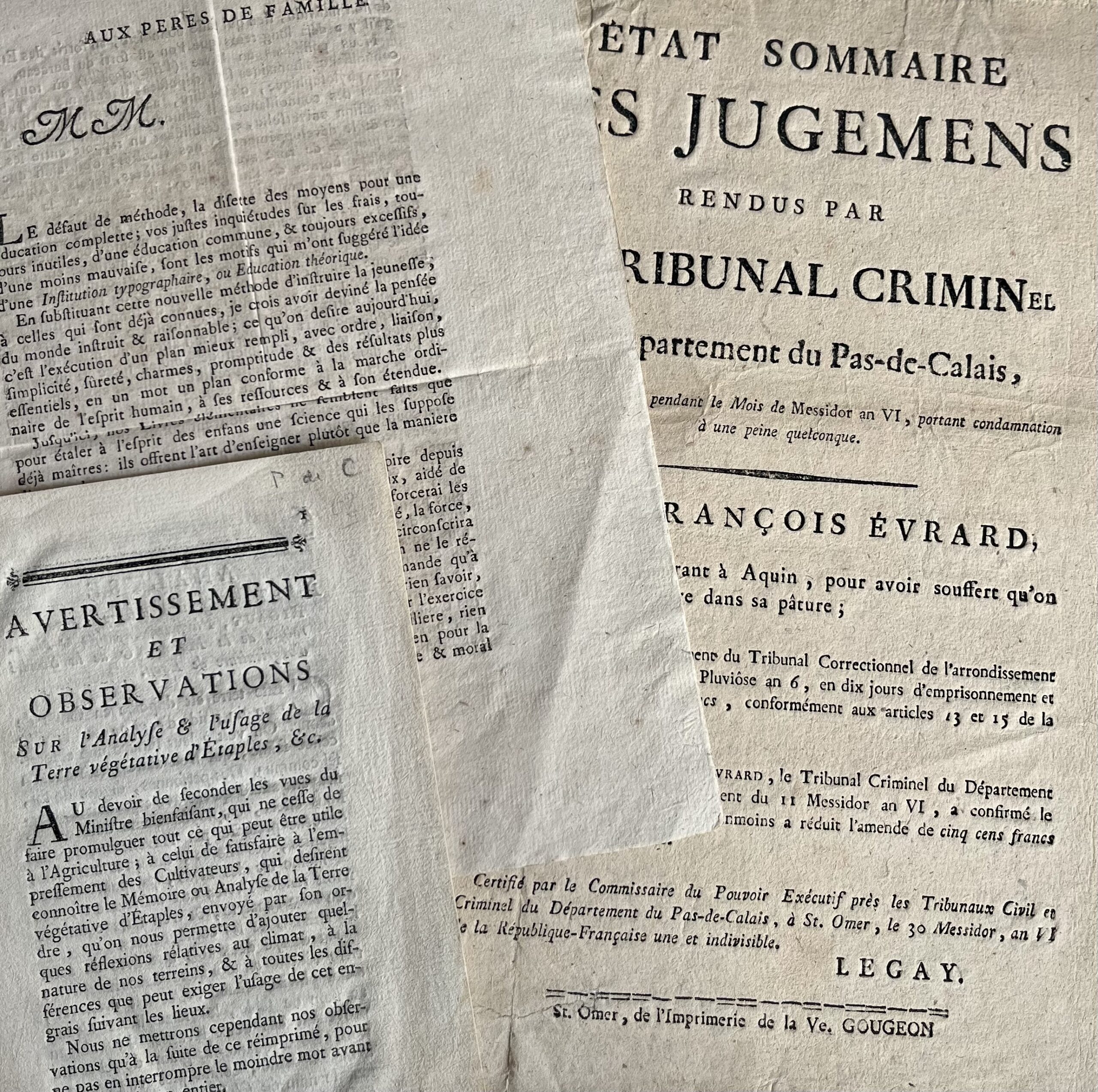 - Affichette : "État sommaire des jugemens rendus par le Tribunal criminel du département du Pas-de-Calais, séant à Saint-Omer, pendant le mois de messidor an 6". 30 x 19,7 cm.