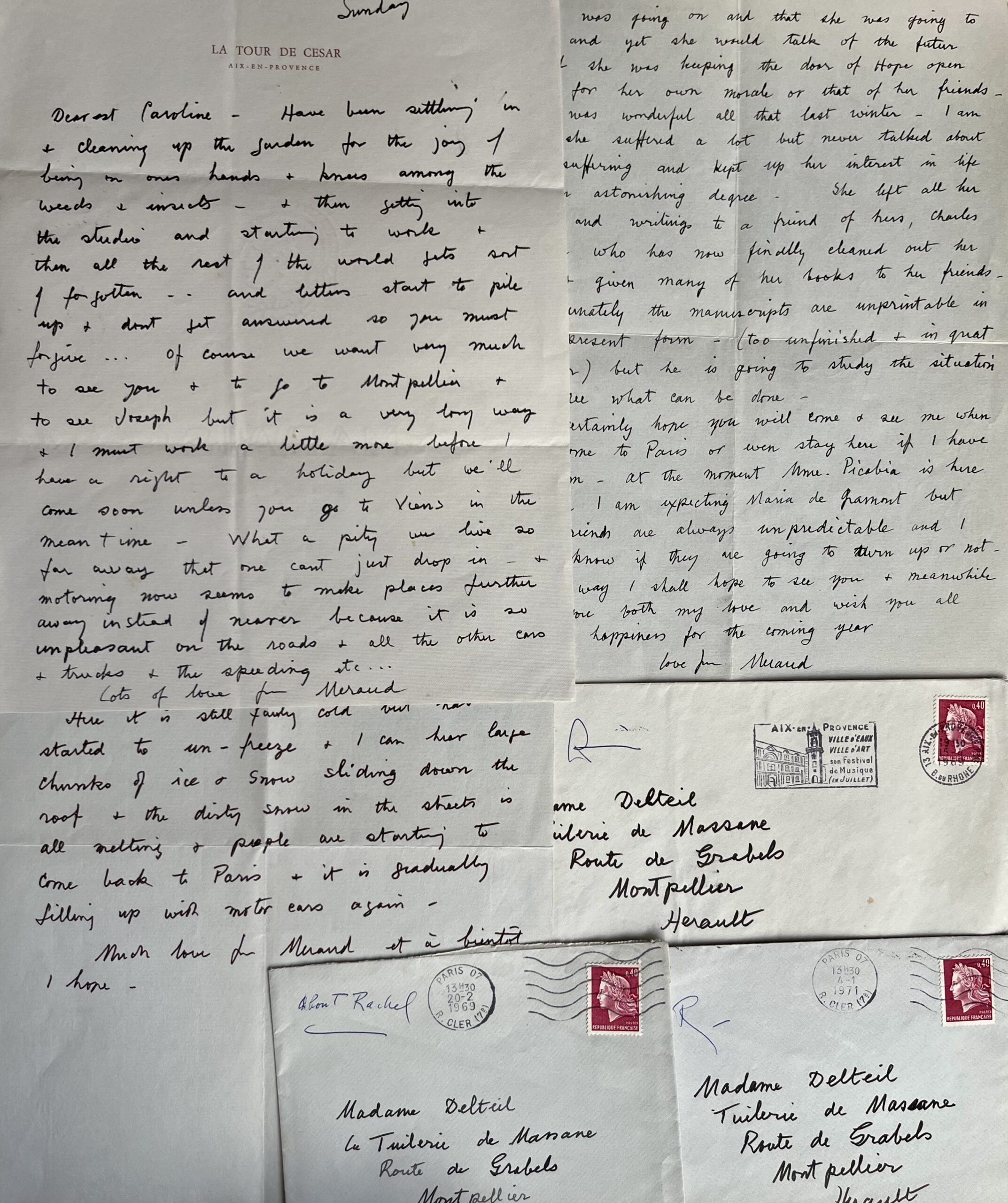 Longue lettre sur la mort de Rachel Jacobs (1927-1968) - qui fut une grande amie de Sam Francis, décrivant son agonie dans un hôpital américain. « She was wonderful all that last winter. I am sure she suffered a lot [elle était atteinte d'un cancer aux ovaires] but never talked about her suffering and kept up her interest in life to an astonishing degree. She left all her books and writings to a friend of hers, Charles Delloye, who has now finally chaned out her flat + given many of her books to her friends. Unfortunately, the manuscripts are unprintable in their present form (too unfinished + in great disorder) but he is going to study the situation and see what can he be done. I certainly hope you will come & see me when you come in Paris or when stay here if I have a room - at the moment Mme Picabia is here + later I am expecting Maria de Gramont […] ». Elle aimerait répondre favorablement à son invitation de venir à Montpellier, mais elle est trop occupée par sa maison et une foule d'activités et doit se remettre au travail avant. Elle espère que la santé de Joseph Delteil est parfaitement rétablie ; elle a passé Noël à Paris avec Cosme, et souhaite qu'elle vienne la voir à Paris, etc.