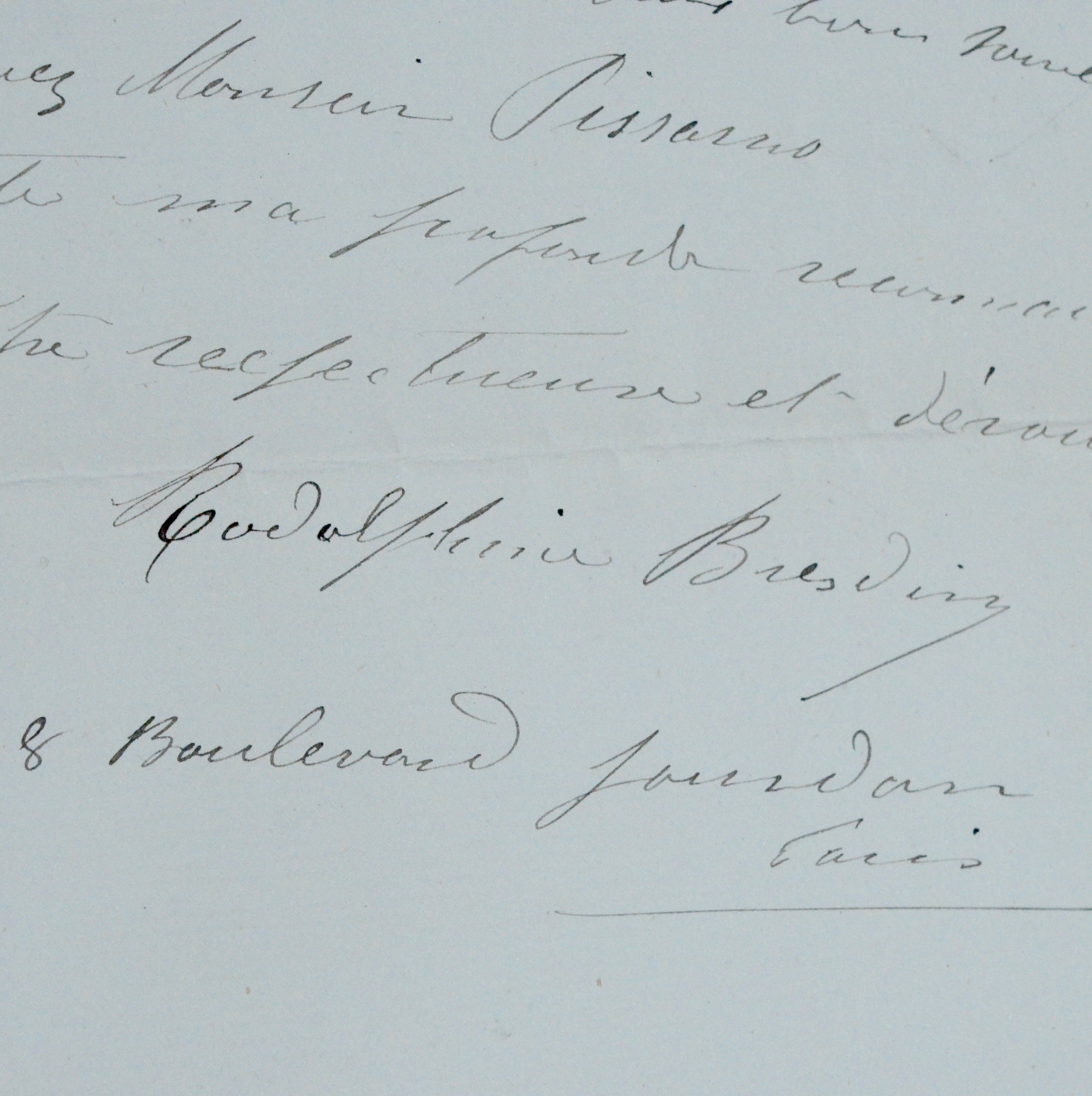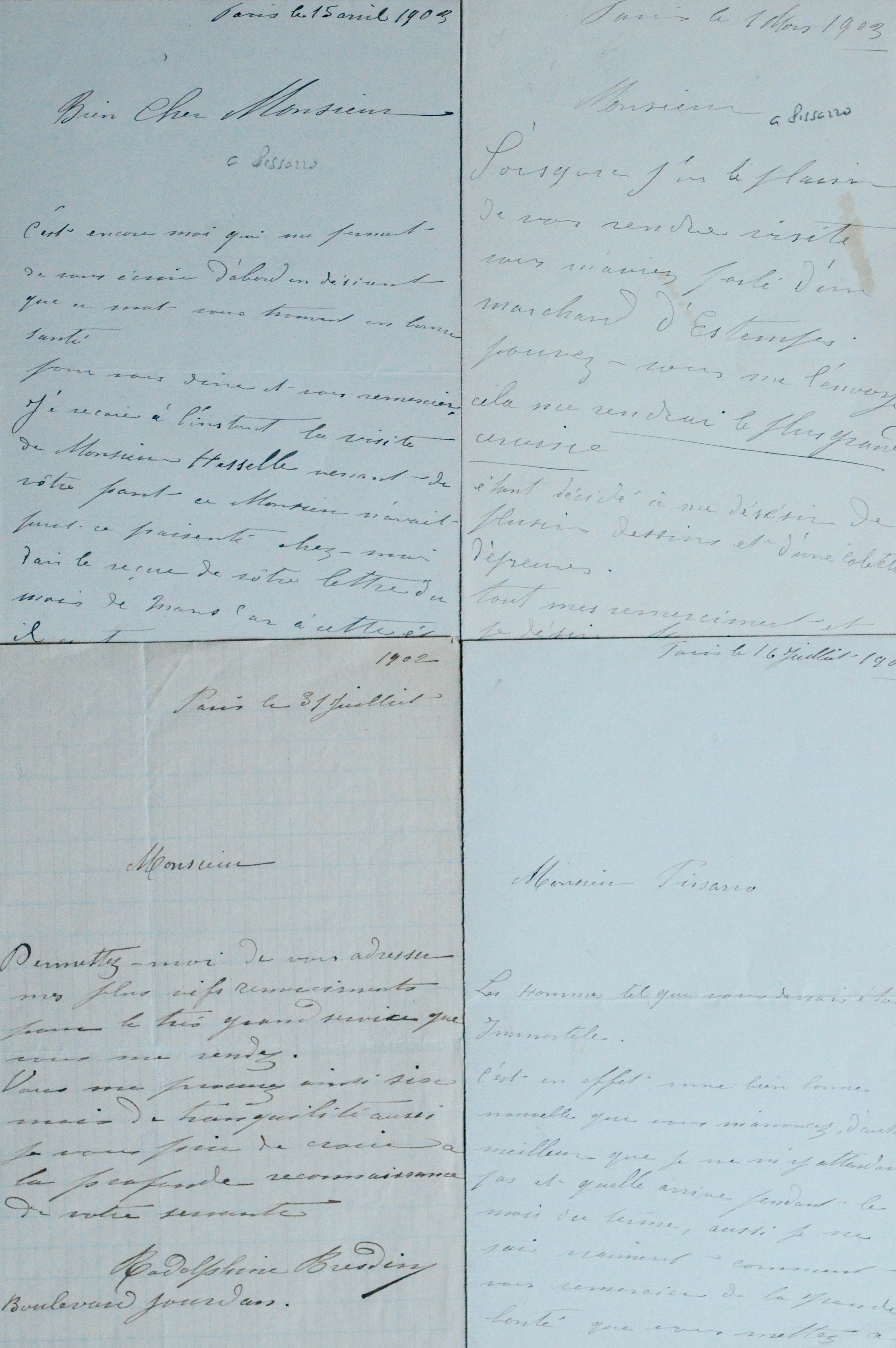 Elle remercie Pissarro de lui avoir communiqué les coordonnées d'un marchand d'estampes, "étant décidée à me dessaisir de plusieurs dessins et d'une collection d'épreuves". Elle vient de recevoir la visite de M. Hesselle : "Il ai tout disposé à mètre trai utile, il m'a dit ne pas vouloir rien séparé de la collection que je possède car jai maintenant il va s'ocupé à parler à des personnes trai importantes, tout cela ne serai pas pour la rentrée c'est à dire le mois d'octobre je ne sais si je pourrai attendre jusque la. En tout cas je doit prendre rendez-vous est aller le voir affin de faire un classement sérieux et faire un catalogue [...]. Mais ce qui presse c'est qu'il m'achète des pièces que j'ai en double affin que je puisse attendre [...]". Dans une dernière lettre, elle ajoute "Les hommes tel que vous devrais étres immortele. C'est en effet une bien bonne nouvelle que vous m'annoncez, d'autant meilleur que je ne m'y attendais pas". Elle ne sait comment remercier Pissarro pour son aide et sa bonté. "Je regrette seulement que les épreuves de ce lot ne soient pas meilleurs. J'aurai l'intention de prier Monsieur Tailliandat de tirer des épreuves des quelques pièces encore en bon état et si le résultat est satisfaisant j'essayerai d'en placer chez les marchands d'estampes". Pour cette aide, Rodolphine veut lui offrir "un des dessins de l'album que je vous ai montré l'hiver dernier, et que je vous soumettai de nouveaux a votre retour a Paris, afin que vous puissiez faire votre choix [...]".