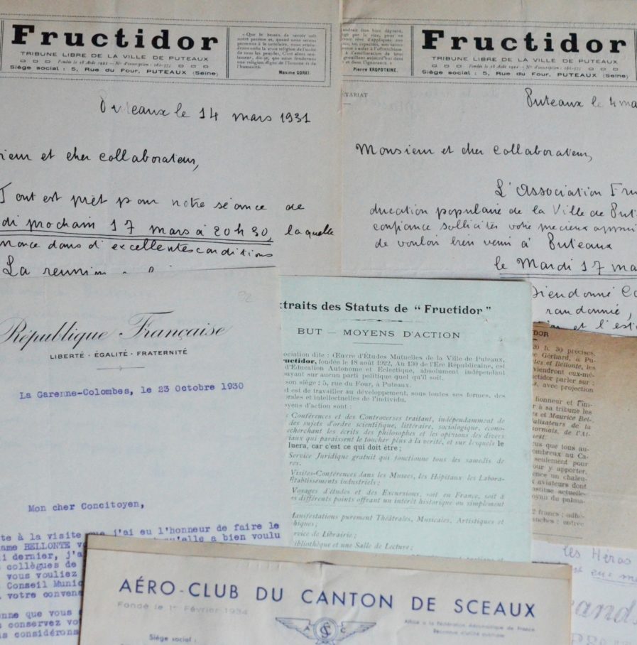 - Fructidor, journal anarchiste de Puteaux : 2 lettres par son secrétaire (Marcel Piron) à Maurice Bellonte, 1931, en-têtes, invitant Costes et Bellonte "à passer une soirée avec les ouvriers de notre cité laborieuse, dont un certain nombre travaillent dans l'aviation [...]". Avec un prospectus imprimé d'adhésion à Fructidor et une affichette ronéotée annonçant la projection du film au Casino de Puteaux, en présence des deux aviateurs.