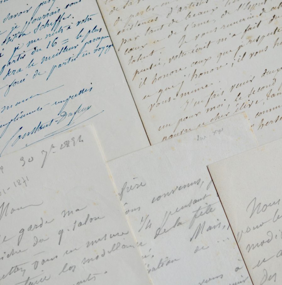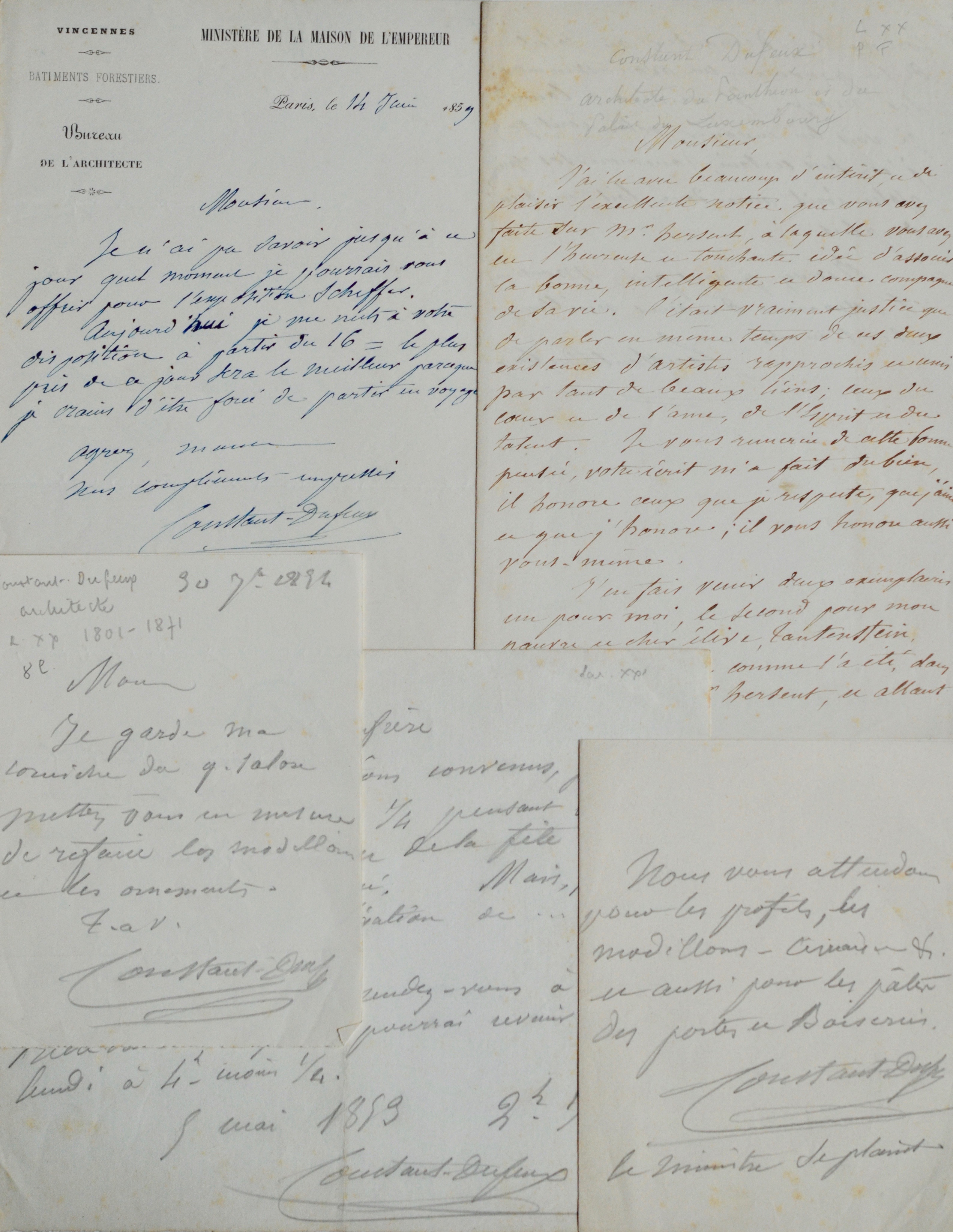 Ensemble de 5 lettres de l'architecte du Panthéon, Simon Claude Constant-Dufeux dont 3 adressées au sculpteur Hardouin. «Je garde ma corniche du grand salon. Mettez-vous en mesure de refaire les médaillons et les ornements». «Nous vous attendons pour les profils, les médaillons, cimaises, etc. et aussi pour les pâtes des portes et boiseries. Le ministre se plaint»… Il rend aussi hommage au peintre Louis Hersent, etc.
