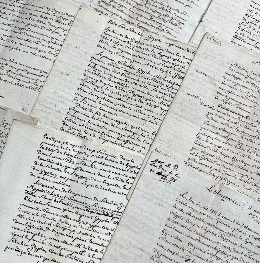 Important ensemble de « fragmens historiques sur Lyon » : « L'observance » (8 pp., mention « les quatre premières pages n'ont pas été imprimées »), « St Irénée » (8 pp.), « Rue des Albergeries » (4 pp.), « Rue Thomassin » (5 pp. dont la première entièrement biffée), « Notice historique sur la rue et porte Trion » (7 pp.), « Note sur Sébastien Gryphe, imprimeur de Lyon » (4 pp.)