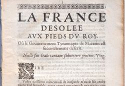 Ensemble de 7 mazarinades, publiées en 1649 durant la Fronde : La France désolée aux pieds du Roy où le gouvernement tyrannique de Mazarin est succinctement descrit (8 pp.) ; La Justification du parlement et de la ville de Paris dans la prise des armes contre l'oppression et tyrannie du Cardinal Mazarin (19 pp.) ; L'Echo lugubre de la France avec l'oppression de la ville de Paris et les ruses du Renard sicilien descouvertes (7 pp.) ; Le Manifeste pour la justice des armes des princes zélez pour le bien de la paix (7 pp.) ; Arrest de la Cour de parlement donné toutes les chambres assemblées le 8 jour de janvier 1649 par lequel il est ordonné que le Cardinal Mazarin vuidera le Royaume [...] (4 pp.) ; Arrest de la Cour de parlement portant que tous les biens meubles & immeubles & revenus des bénéfices du Cardinal Mazarin seront saisis & commissaires, séquestres & gardiens establis à iceux (4 pp.) ; Arrtest de la Cour de parlement sur la proposition faite par Monseigneur le Prince de Conty pour l'éloignement du Cardinal Mazarin (4 pp.).