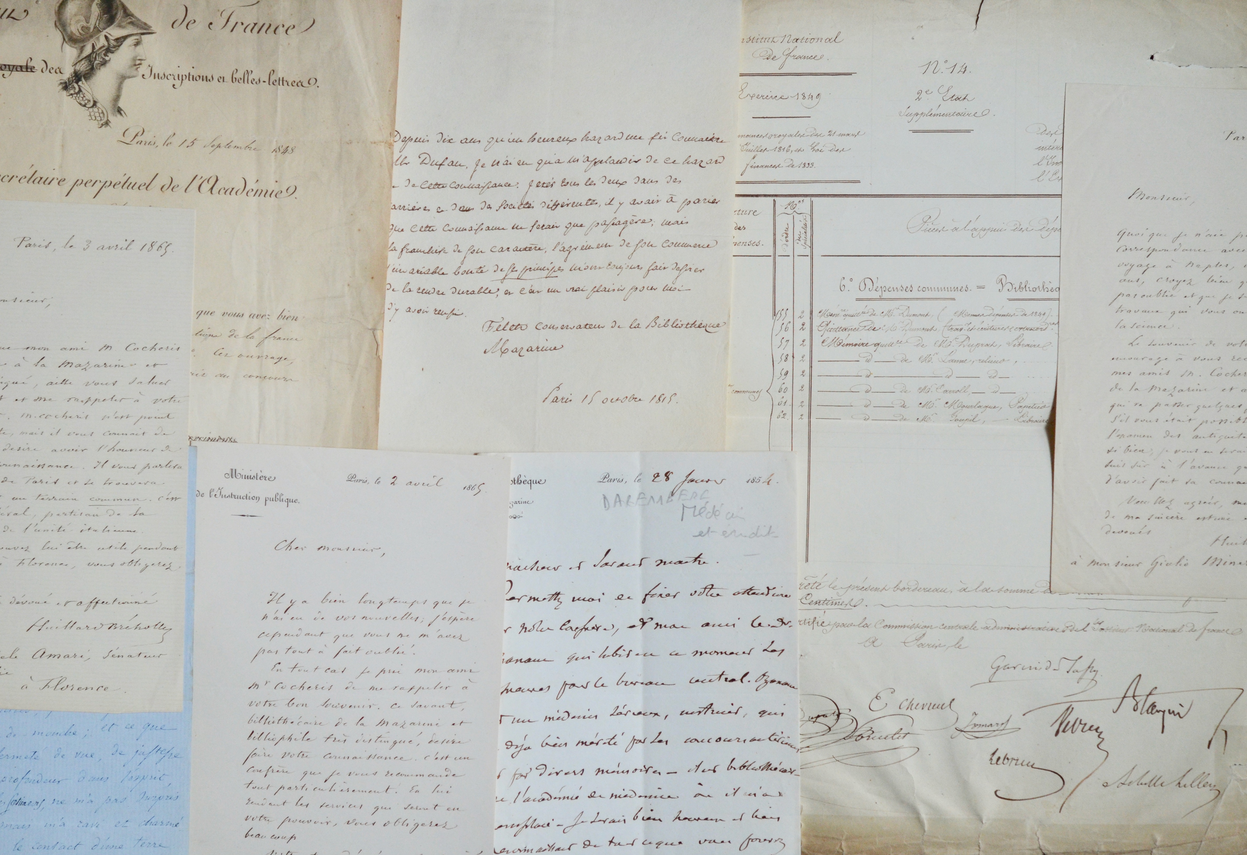 Charles-Marie de FELETZ (comme conservateur de la Bibliothèque Mazarine, 1815), Victor CHASLES (à Eugène Crépet, 4 pp.), Charles Victor DAREMBERG (recommandation du Dr Ozanam), 3 lettres de l'historien Jean HUILLARD BRÉHOLLES (recommandant Hippolyte Cocheris bibliothécaire à la Mazarine), Charles-Athanase WALCKENAER (dépôt d'un ouvrage) + 1 bordereau de dépenses à la Bibliothèque de l'Institut signé par BLANQUI, JOMARD, CHEVREUL, etc.