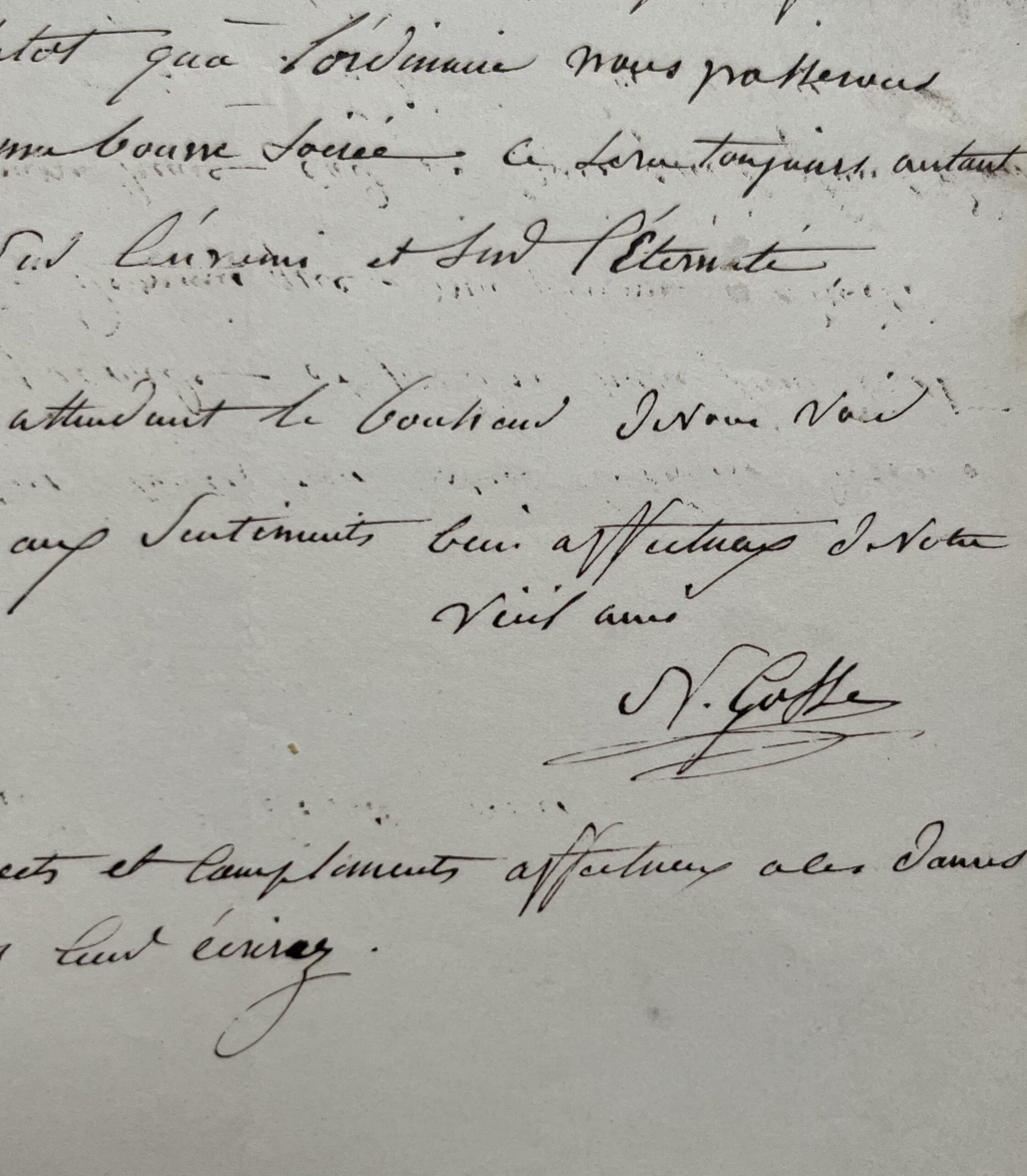 "Je vous envoie votre portrait bien tard sans doute selon votre désir mais je ne suis pas fâché de ce retard parce qu'il a pu sécher un peu plus. Si vous trouvez qu'en le mettant droit il ait l'air de lever un peu trop la tête il n'y a qu'à ouvrir la feuillure derrière pour le faire marcher dans le sens contraire où la tête semble inclinée. Je n'ai pu faire faire cette opération n'ayant pas de menuisier dans ma manche [...]". "Puisque vous voulez bien avoir la bonté de nous faire voir la Joconde et prendre notre jour, c'est jeudi après demain que ma femme a choisi [...]". Il évoque leurs amis communs, la décoration de son nouvel appartement de Joinville faite d'œuvres de ses amis peintres, le décès de son épouse. "Un bon ecclésiastique de mes amis m'a dit de travailler, en suivant son conseil, je n'ai pas retrouvé le bonheur, mais j'ai trouvé dans le travail un adoucissement à mon éternel chagrin [...]. Dans la disposition décorative de mon nouvel appartement à Joinville, j'ai disposé dans la première entrée, des bustes de mes amis, au nombre desquels sont ceux de (Lallou?), d'Horace et Dantan, j'imagine bien que vous devez avoir le vôtre de petite dimension, et c'est lui mon vieil ami que je viens vous prier de me donner [...]". "Je dois aller faire une visite à M. Arago [...], mon tableau de la reine Hortense avance beaucoup et j'espère que samedi il pourra le voir presque terminé"