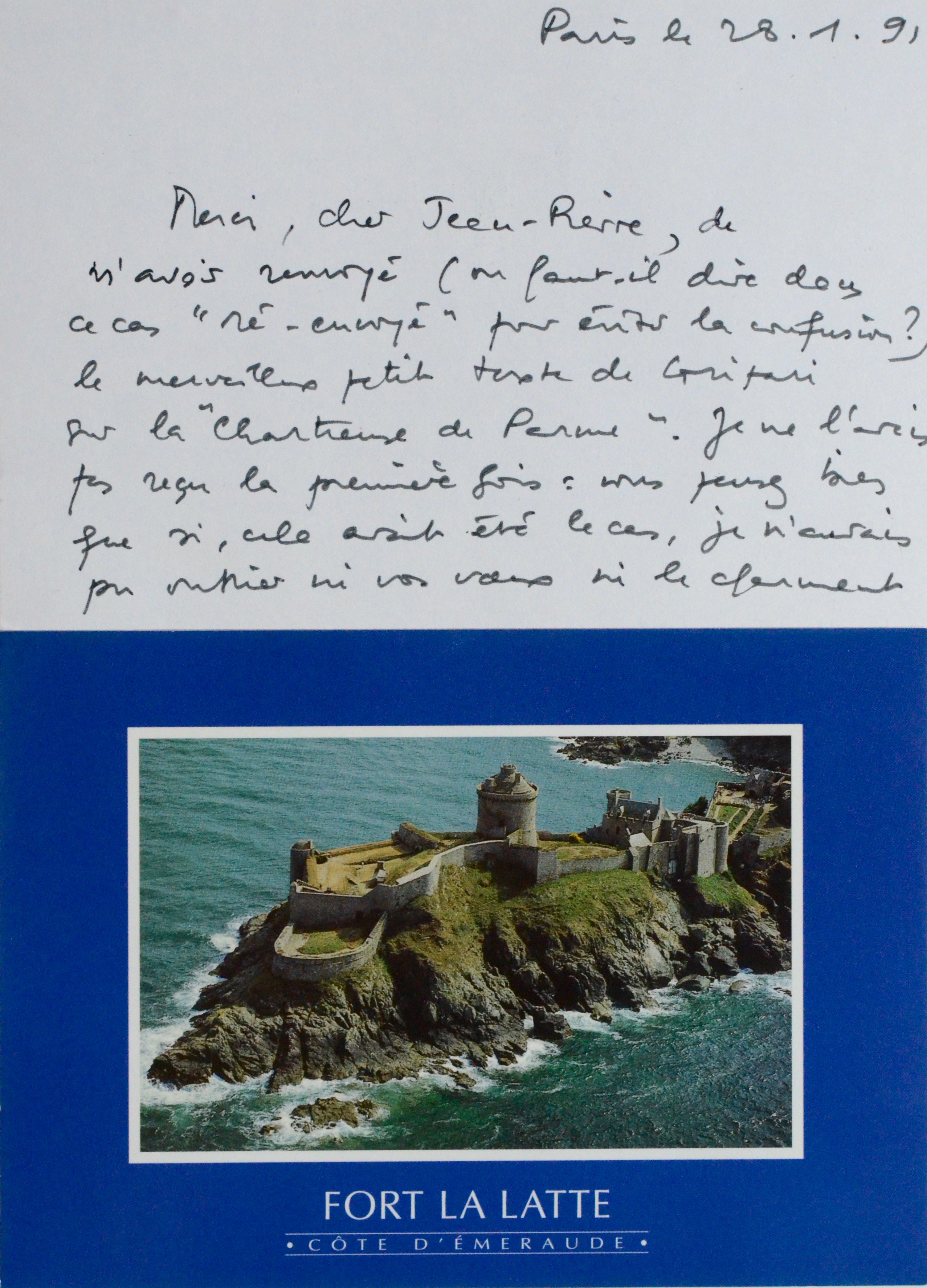 Ensemble de deux cartes de Françoise Chandernagor. Elle remercie Rudin de l'envoi d'un texte consacré à La Chartreuse de Parme et évoque Vialatte. Par ailleurs, elle dit avoir reçu une avalanche de courriers après la publication de La Première épouse et se désole de ne pas avoir vu Rudin au déjeuner Giono.