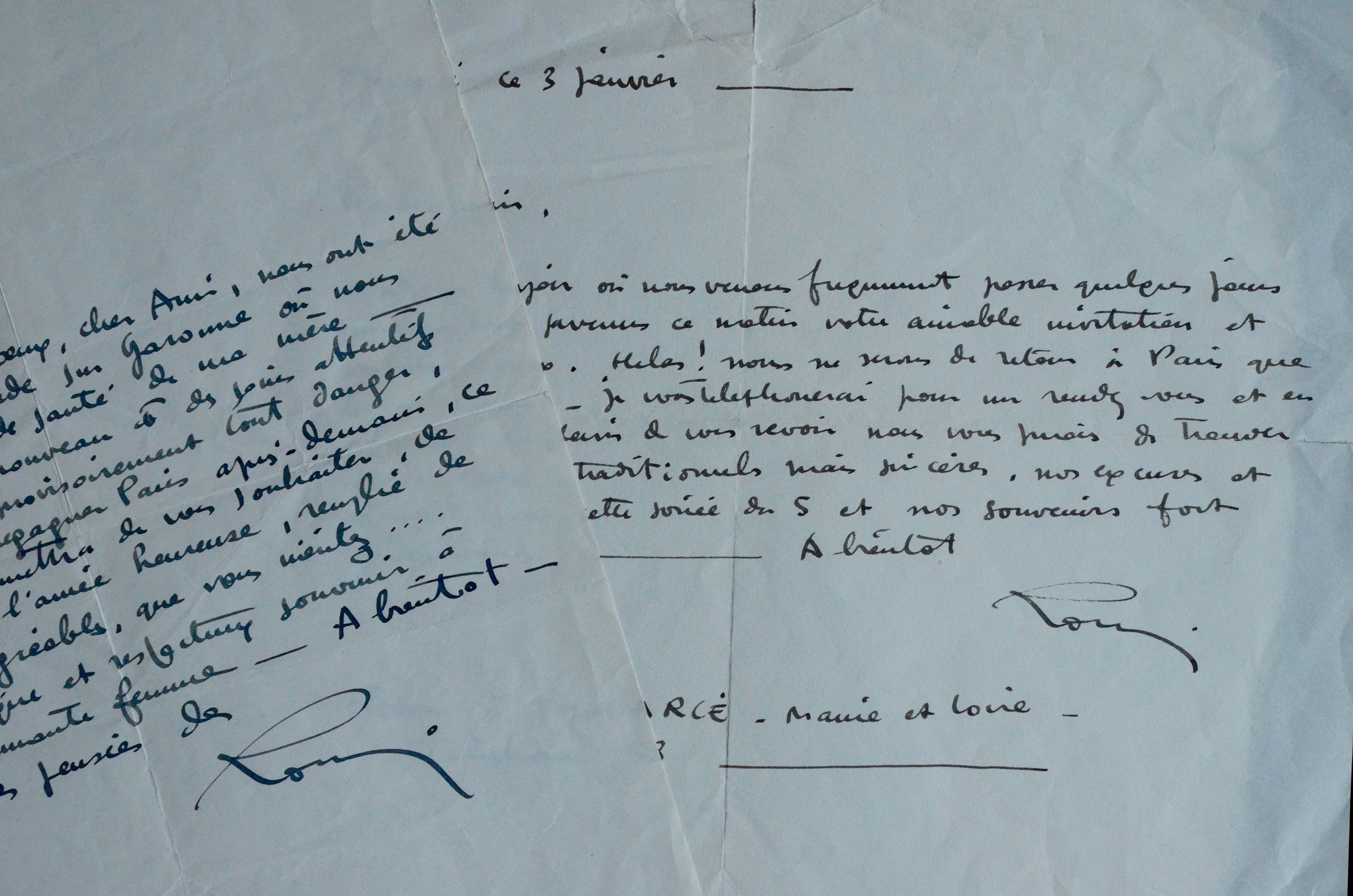 Voeux, invitations et rendez-vous de Romi. Nouvelles familiales et déplacements, etc. "Vos très aimables voeux, cher ami, nous ont été transmis à Grenade sur Garonne où nous retient l'état de santé de ma mère, un traitement nouveau et des soins attentifs ayant écarté provisoirement tout danger. Nous espérons regagner Paris après-demain [...]".