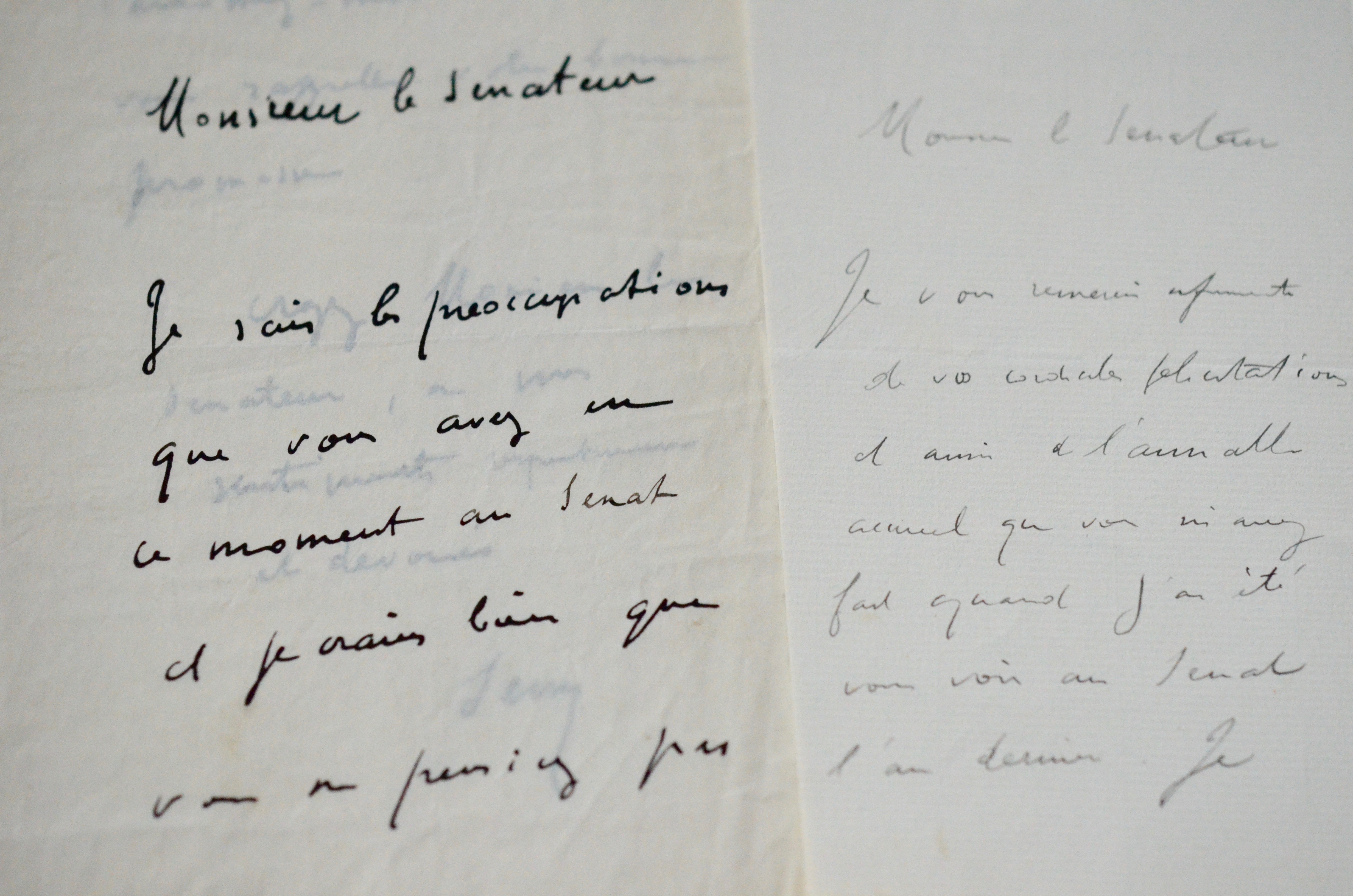"Je sais la préoccupation que vous avez en ce moment au Sénat et je crains bien que vous ne pensiez pas à moi... Pardonnez-moi de venir vous rappeler votre bonne promesse [...]" . "Je vous remercie infiniment de vos cordiales félicitations et aussi de l'aimable accueil que vous m'avez fait quand j'ai été vous voir au Sénat l'an dernier. Je sais quelle part vous avez pris dans cet heureux événement et je vous en exprime toute ma reconnaissance".