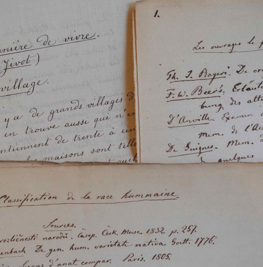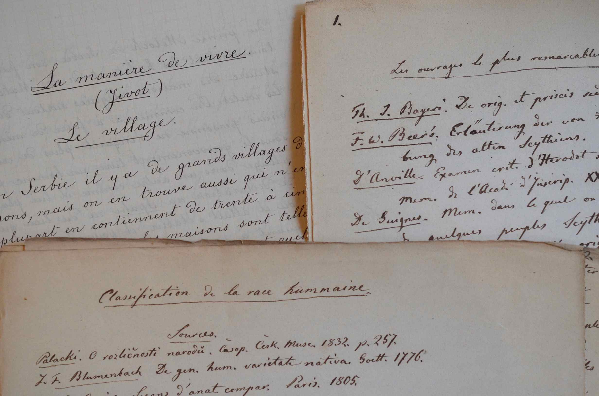 Ensemble de manuscrits de Massieu de Clerval sur la Serbie et les peuples des Balkans : 1. Manuscrit de 38 pp. in-4, La Manière de vivre [en Serbie] : le village, la communauté domestique, le chef de la maison, les «Kmet» [paysans notables], le cabaret, l'apprenti, le «muselim», l'amende, le prix du sang, le brigand, le salaire des jureurs, la preuve par l'eau bouillante et le fer chaud, etc. 2. Notes autographes sur les travaux de Pavel Josef Safarik (22 pp. in-folio) : classification générale des races, les Seythes d'après Safarik, classification des dialectes slaves, topographie de l'ancienne Slavie. 3. Notes autographes sur la philologie comparée d'Alfred Maury (22 pp. in-folio). 4. Etudes sur les anciens peuples qui ont colonisé les Balkans : les Sarmates (2 manuscrits, 8 pp. et 36 pp.), les Alains (2 manuscrits, 10 et 15 pp.) + une douzaine de pp. de notes diverses.