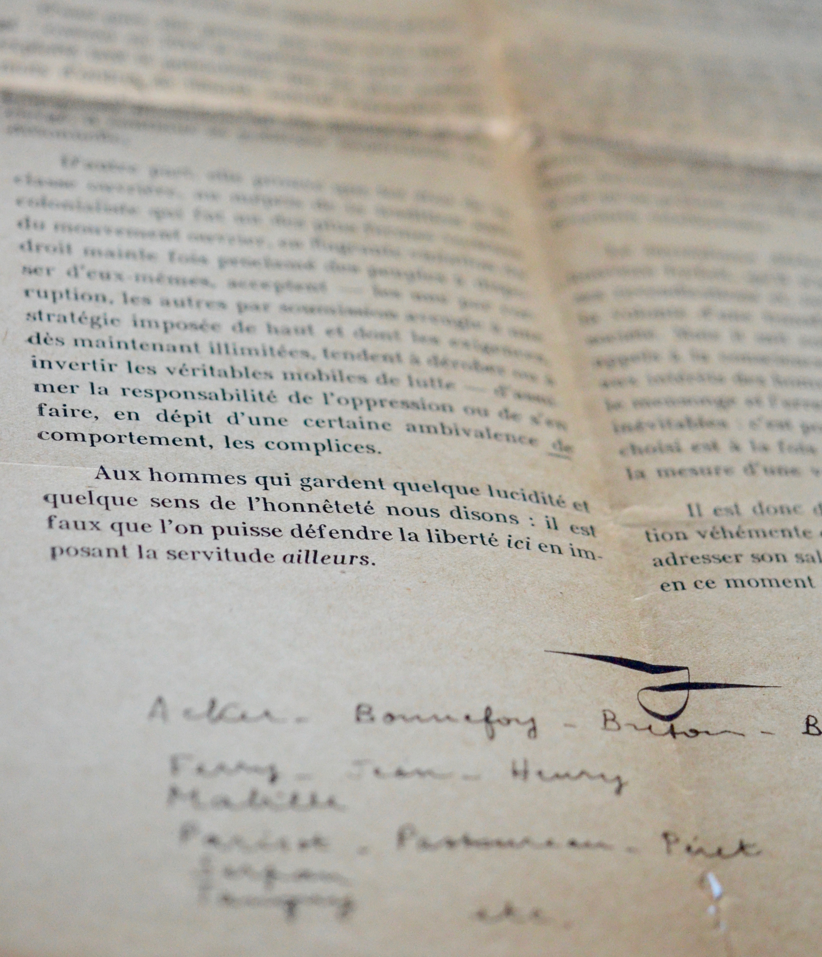 En pied, André Breton a inscrit de sa propre main, au feutre noir, les noms des signataires suivant, dont le sien, à l'emplacement où ils devront être imprimés définitivement : "[Adolphe] Acker - [Maurice] Bonnefoy - Breton - [Jacques] Brunius - [Marcelle] Ferry - [Marcel] Jean - [Maurice] Henry - [Pierre] Mabille - [Henri] Parisot - [Henri] Pastoureau - [Benjamin] Péret - [Iaroslav] Serpan - [Yves] Tanguy etc."