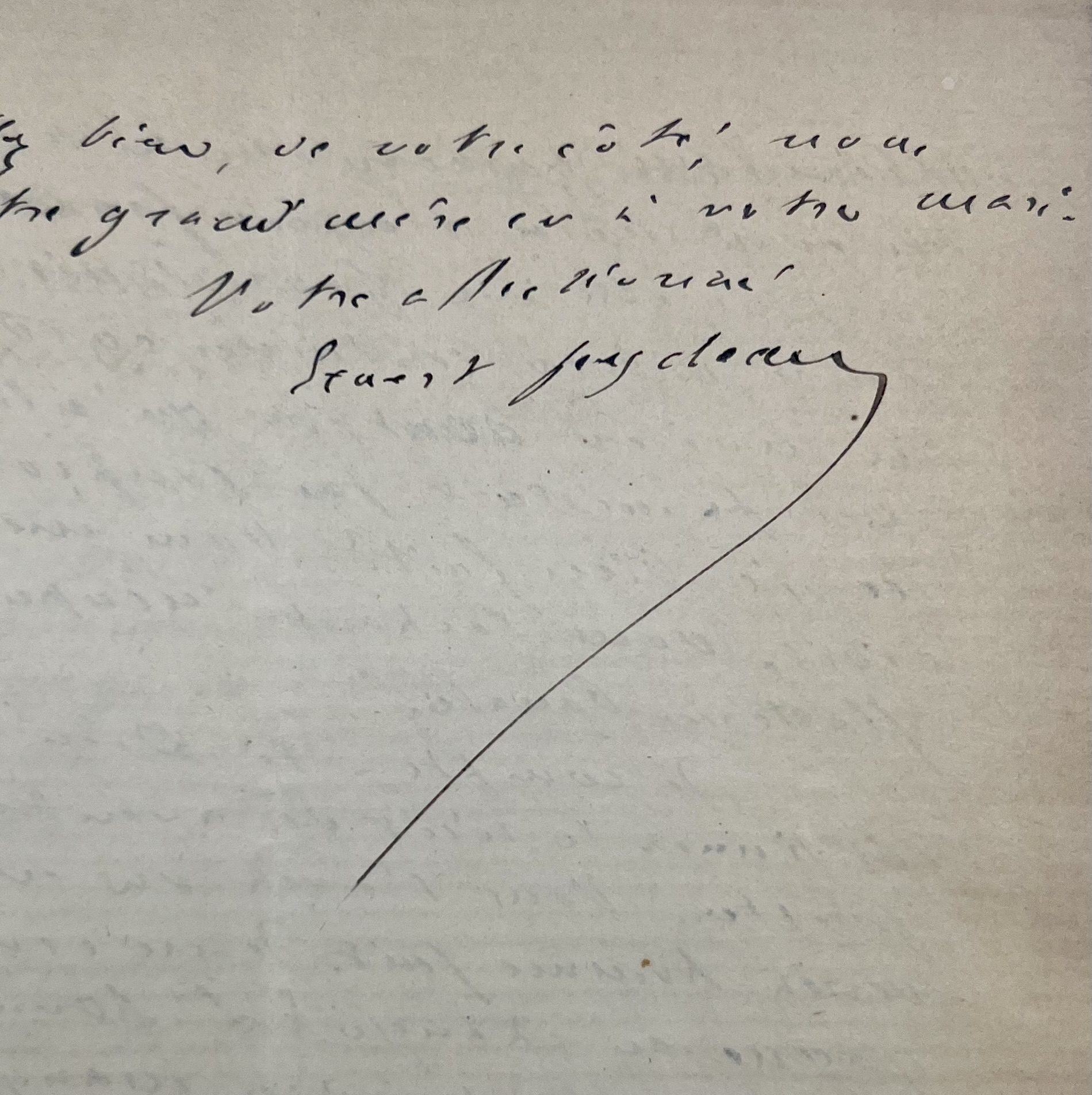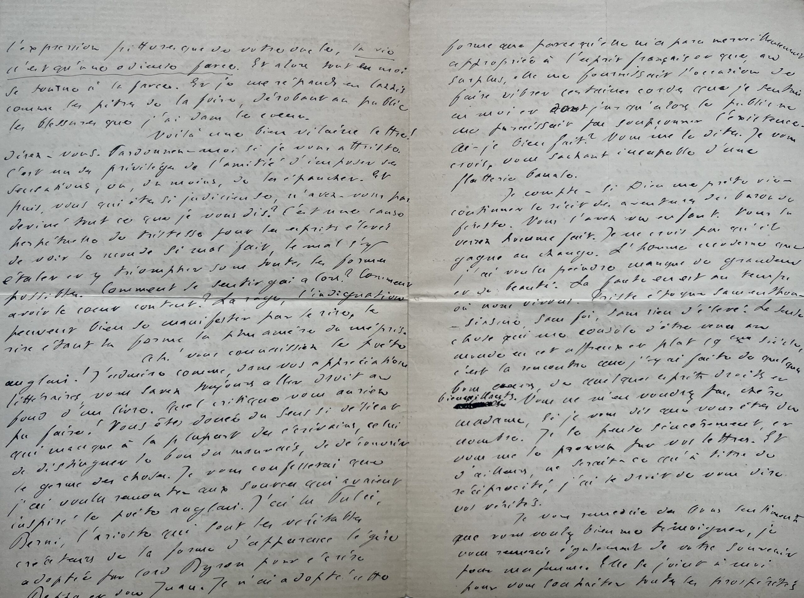 "Si jamais l’envie pouvait me passer d’écrire des livres, je crois que j’en écrirais encore pour l'unique plaisir de recevoir les charmantes lettres que vous voulez bien m’adresser à leur occasion. Je regrette même beaucoup de me sentir incapable de publier chaque année un plus grand nombre d’ouvrages. Si ma Muse était plus fertile, il n’y aurait presque pas de lacunes dans notre correspondance, et je pourrais ainsi me consoler à demi de ne pas vous voir, en goûtant le plaisir de votre charmante conversation épistolaire.
