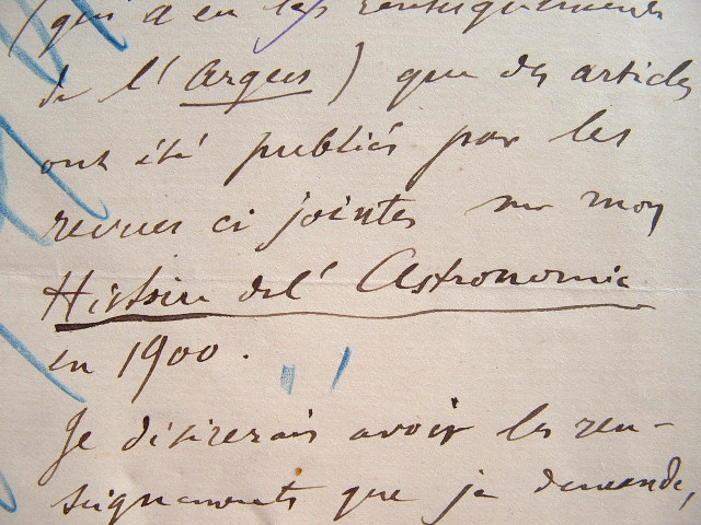 «J'ai appris par mon éditeur (qui a eu les renseignements de l'Argus) que des articles ont été publiés par les revues ci-jointes sur mon Histoire de l'astronomie en 1900». Il souhaite les recevoir.