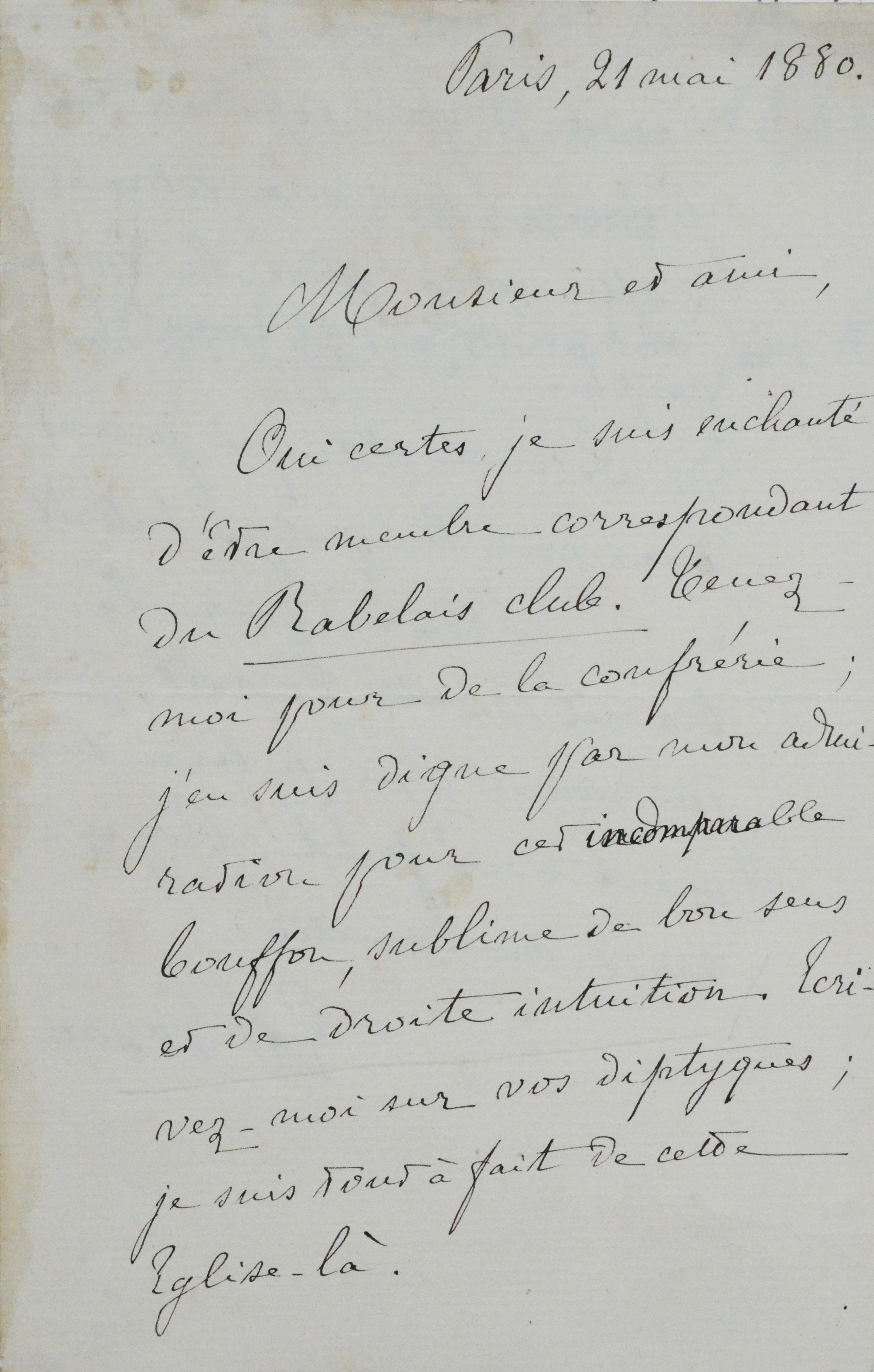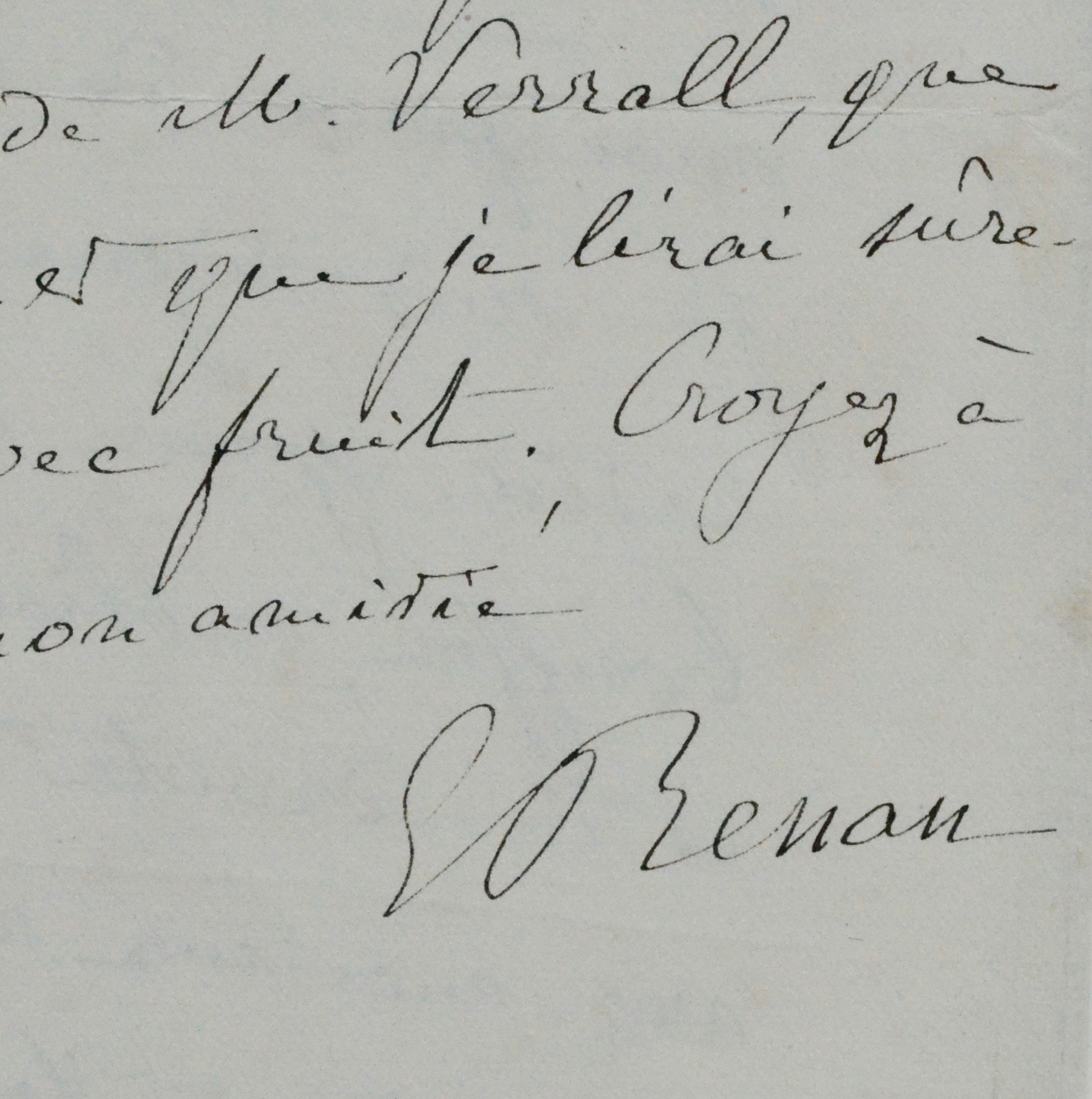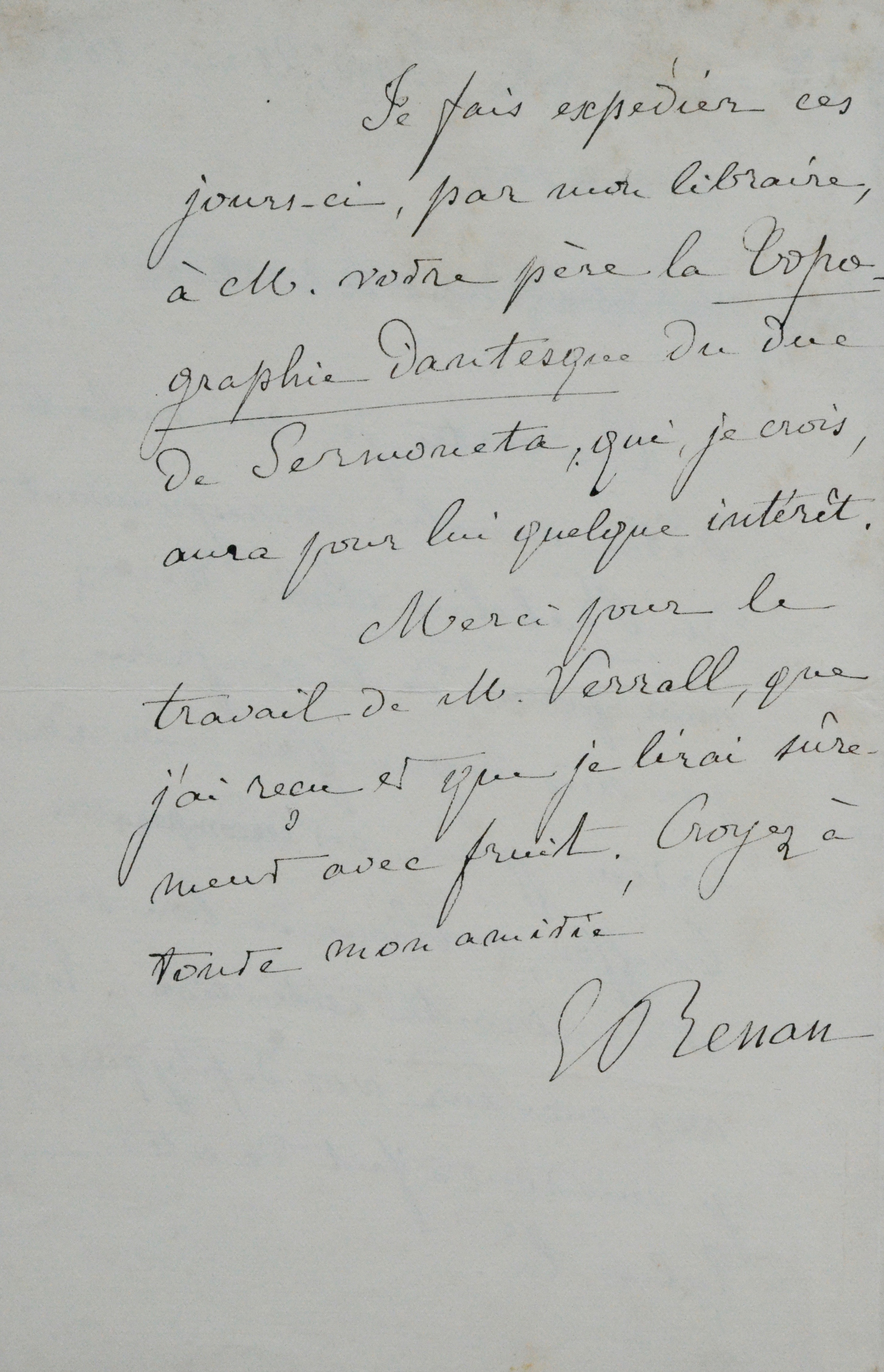 "Oui certes, je suis enchanté d'être membre correspondant du Rabelais Club. Tenez-moi pour de la confrérie ; j'en suis digne par mon admiration pour cet incomparable bouffon, sublime de bon sens et de droite intuition. Ecrivez-moi sur vos diptyques ; je suis tout à fait de cette église-là [...]". Renan s'engage à expédier au père de son correspondant "la topographie dantesque du duc de Sermoneta [...]. Merci pour le travail de M. Verrall, que j'ai reçu et que je lirai sûrement avec fruit. Croyez à toute mon amitié."