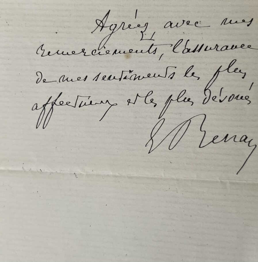 Ernest Renan (Tréguier, 1823/1892)"Cher Monsieur, par suite de diverses erreurs et d’un peu de désordre dans mon cabinet, votre belle traduction de Don Quichotte ne m’est tombée entre les mains que ce soir. Je viens de passer deux heures à la lire, et j’en suis enchanté. Votre style est coulant et facile, comme celui d’un original. Je n’avais jamais tant goûté cet inimitable chef-d’œuvre. Merci ; je vous lirai tout entier. Certaines parties m’ont fait le même effet que si je les lisais pour la première fois. Je vous félicite de ce beau travail, qui vous fait le plus grand honneur. Agréer, avec mes remerciements, l’assurance de mes sentiments les plus affectueux et les plus dévoués. E. Renan".