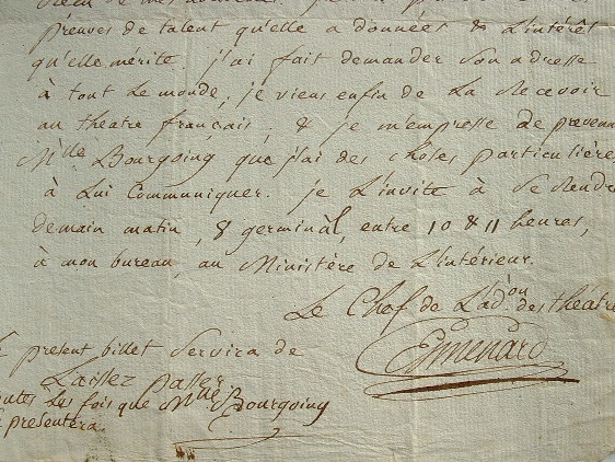 Esménard souhaitait depuis longtemps répondre à Mlle Bourgoing, mais il n'avait pas son adresse. "Je n'ai pas oublié les preuves de talent qu'elle a données et l'intérêt qu'elle mérite. J'ai fait demander son adresse à tout le monde ; je viens enfin de la recevoir au Théâtre Français ; et je m'empresse de prévenir Mlle Bourgoing que j'ai des choses particulières à lui communiquer [...]". [Esménard était alors chef de l'administration des théâtres au ministère de l'Intérieur].