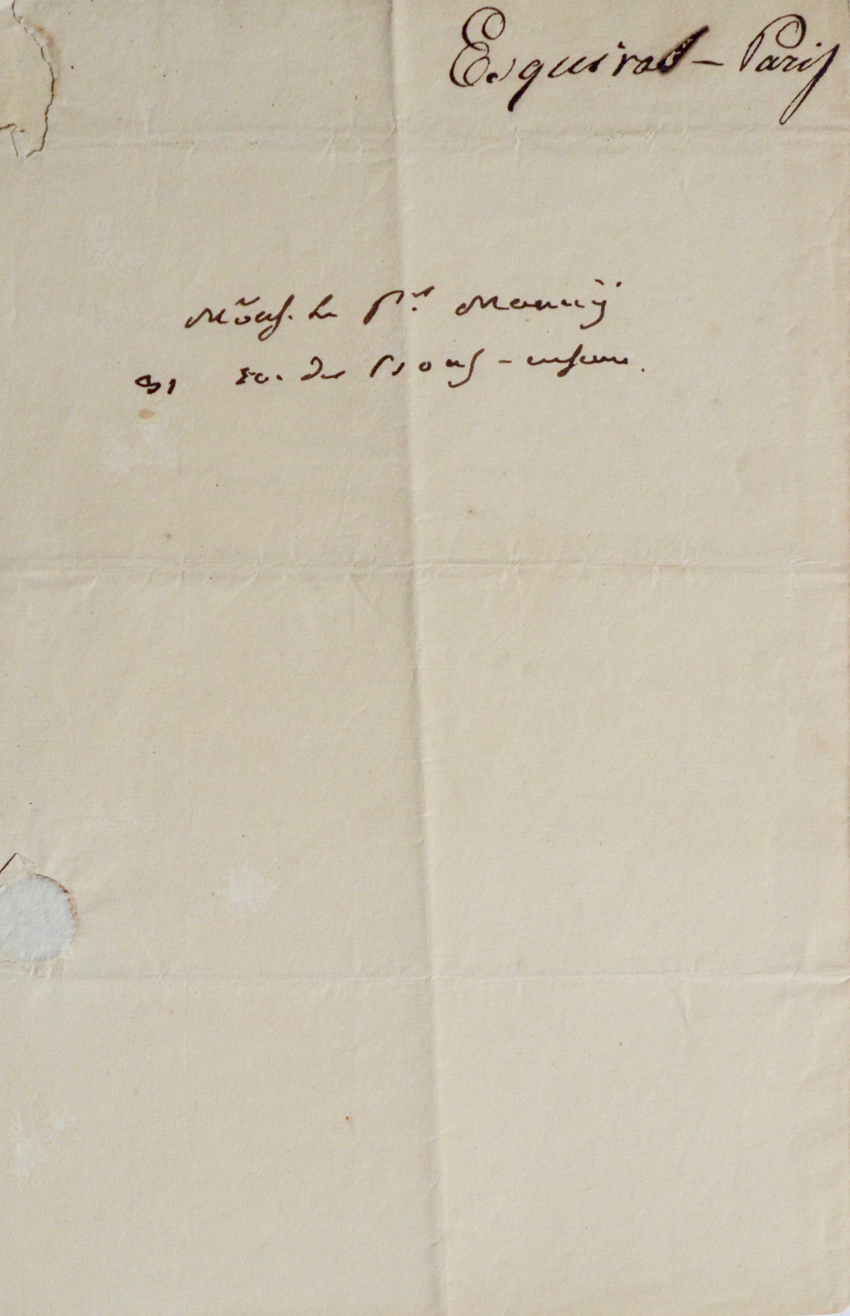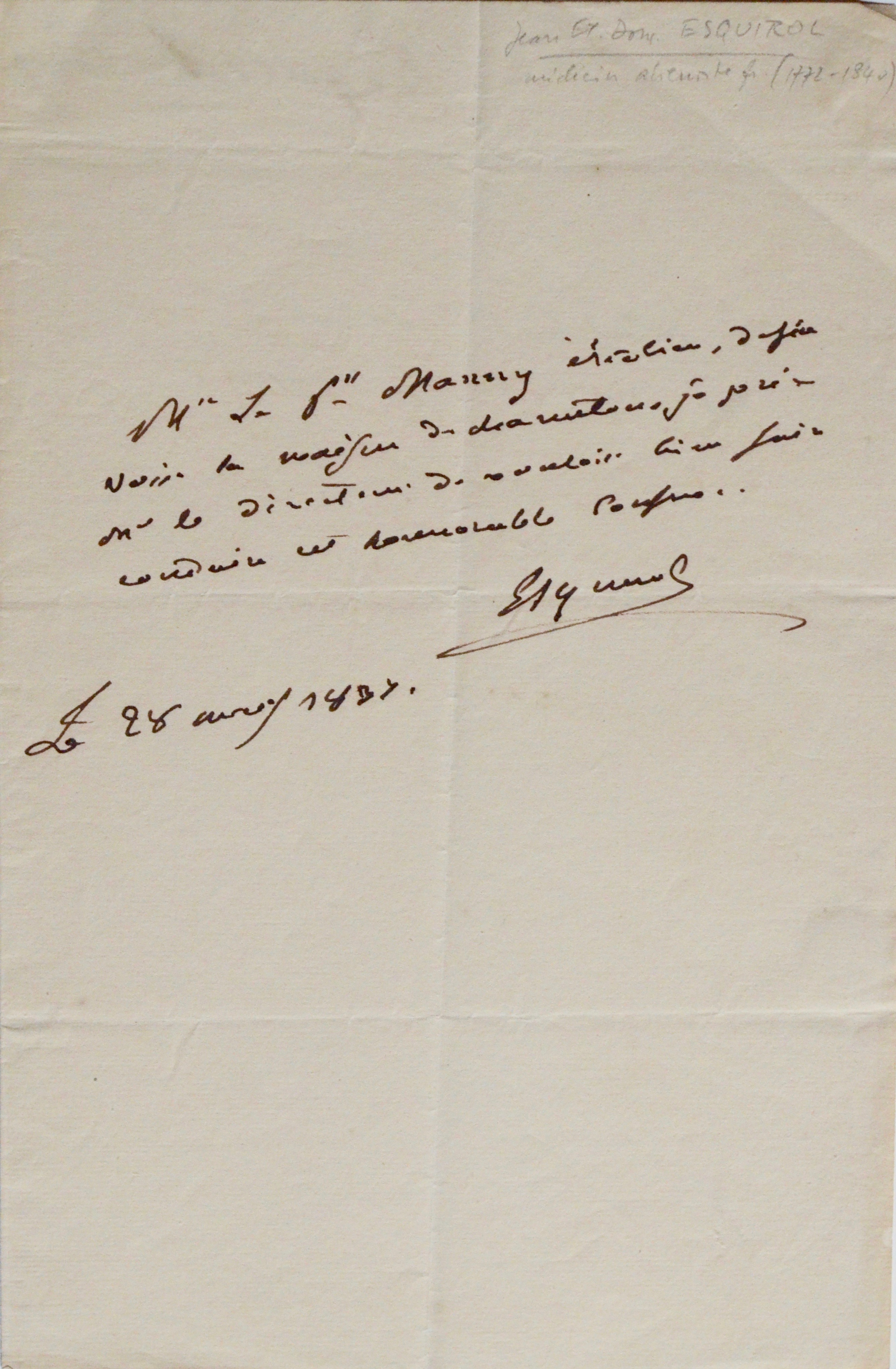 Jean Etienne Esquirol (Toulouse, 1772/1840)Esquirol, ancien directeur de l'asile psychiatrique de Charenton, délivre un billet à l'attention de son confrère italien, le médecin Pietro Manni, pour que celui-ci puisse s'y rendre.