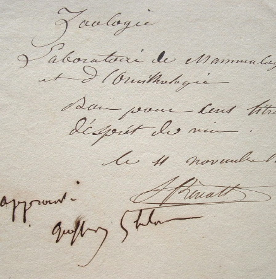 Pièce manuscrite signée Rinalt (?) : «Zoologie. Laboratoire de Mammalogie et d'ornithologie [du Muséum d'Histoire Naturelle]. Bon pour cent litres d'esprit de vin». Apostille signée par Etienne Geoffroy-Saint-Hillaire acceptant la livraison.