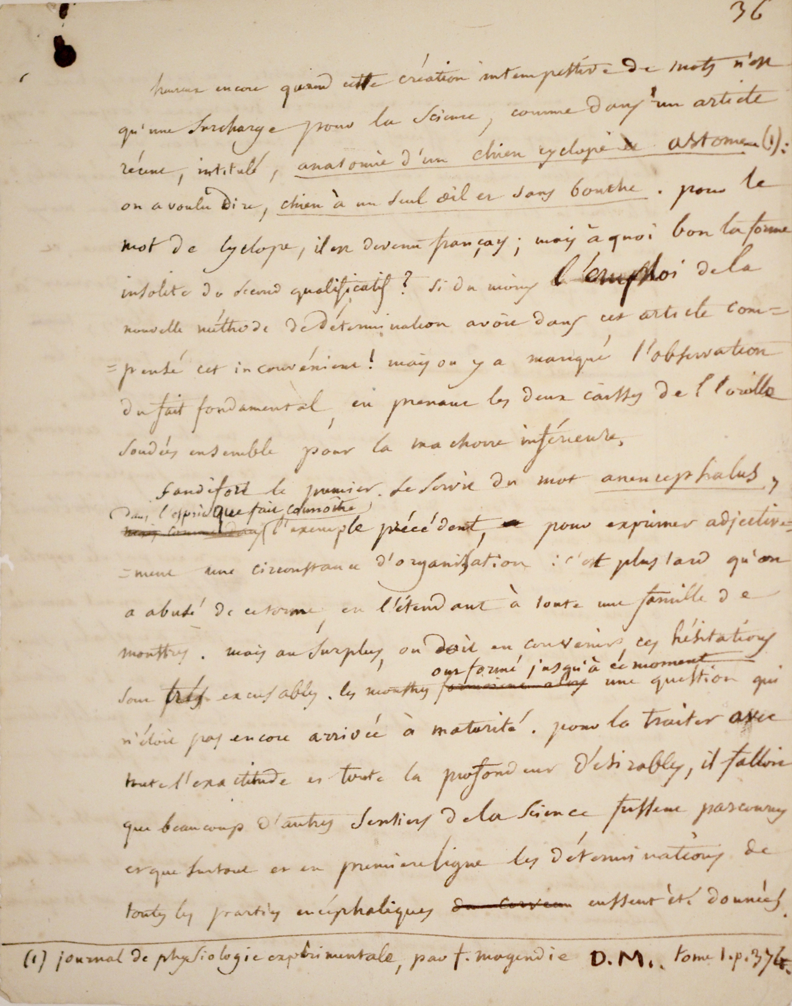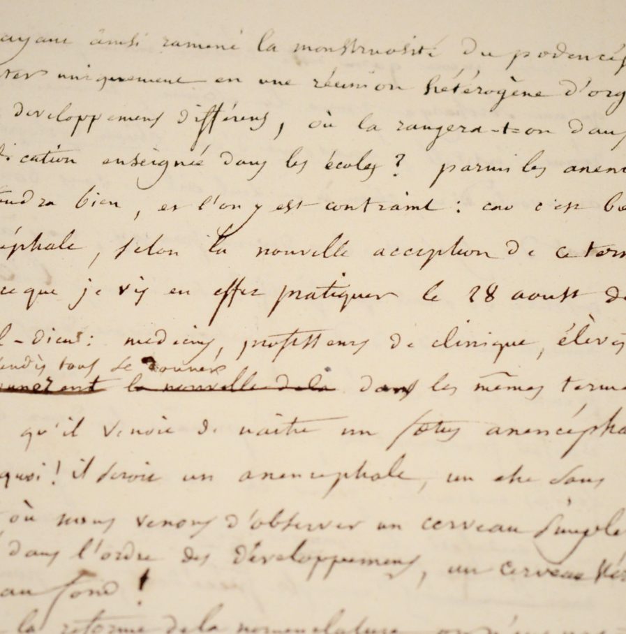 Étienne Geoffroy Saint-Hilaire (Etampes, 1772/1844)Manuscrit d'Étienne Geoffroy Saint-Hilaire. Il contient la seconde partie du chapitre intitulé "Sur la nomenclature", de son célèbre ouvrage de tératologie Philosophie anatomique : Des monstruosités humaines (Paris, 1822). Il est ici question des êtes nés sans cerveau, et des termes nouveaux pour qualifier les particularités des monstres. Ratures, corrections et ajouts.
