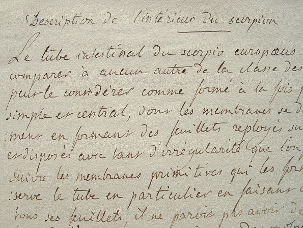 Manuscrit anonyme intitulé : "Description de l'intérieur d'un scorpion". Il s'agit des conclusions d'une expérience visant à mettre en évidence le système intestinal du scorpio europaus «qui ne peut se comparer à aucun autre de la classe des insectes». L'auteur en explique les caractéristiques et les singularités : le tube digestif est entouré de petits feuillets qui, à la loupe, semblent être des glandes ; l'estomac d'une allure très étrange est difficile à distinguer. «Cette partie représente le rectum ; mais, à dire vrai, il paraitroit que le tube intestinal n'a, dans cet animal, d'autres fonctions que de conduire et de diriger la pâte alimentaire contenue dans les feuillets dont il est entouré ; ce qui le prouve, c'est que lorsque l'on ouvre l'insecte on voit les feuillets remplis d'une matière brune et colorée qui, épanchée par l'ouverture et la macération, laisse voir aux membranes la blancheur qui leur est propre ; le nombre de ces feuillets est tel qu'ils remplissent toute la cavité du corps. En ouvrant ces feuillets (dont l'apparence est grossièrement celle d'une fraise de veau), il est très facile d'en faire sortir la pâte [...]».