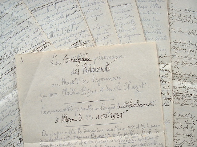 Manuscrit écrit à quatre mains par Emile Chazot et entièrement retravaillé par Claudius Roux, avec des passages entièrement réécrits, intitulé : "La Bourgade préromaine des Essarts au Mont d'Or lyonnais par MM. Claudius Roux et Emile Chazot". Ce texte a été lu au Congrès Rhodania de Mâcon le 23 août 1935, et publié à Vienne l'année suivante sous un titre un peu différent : La Station préromaine ou bourgade gauloise des Essarts dans le Mont d'Or lyonnais.