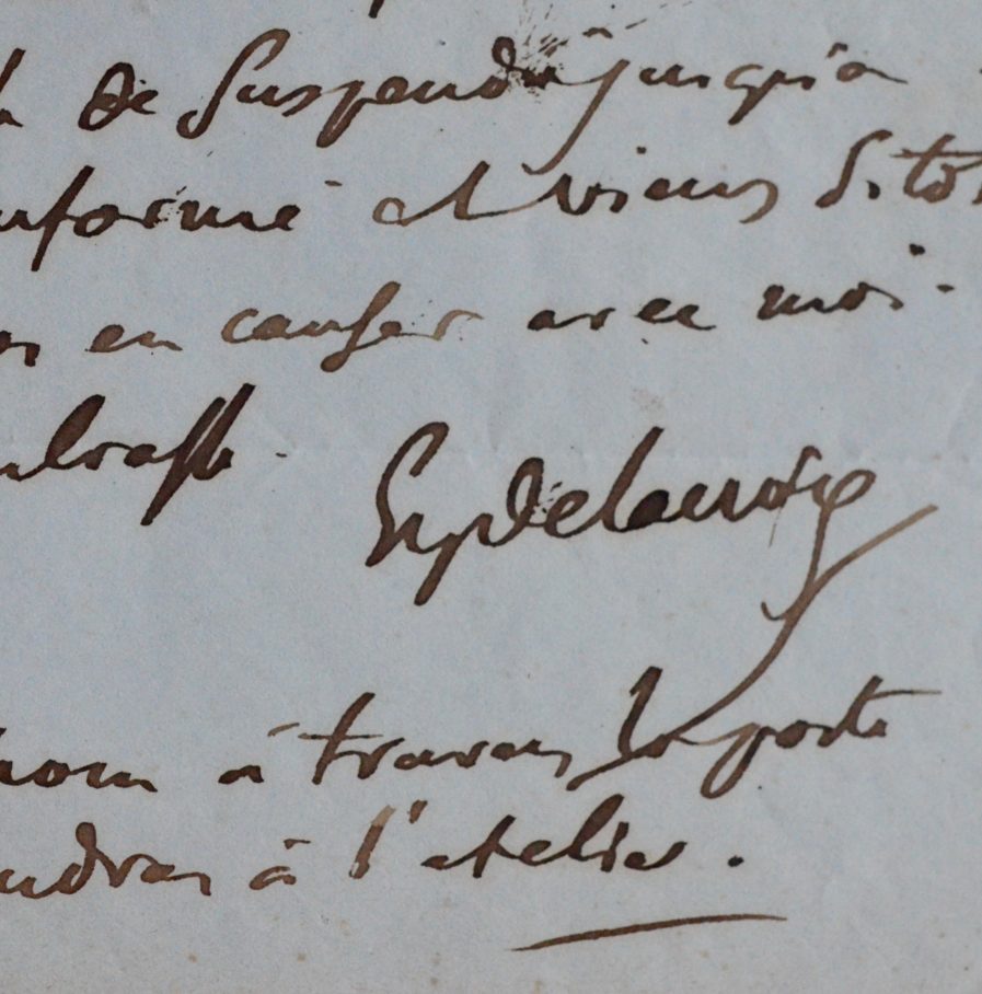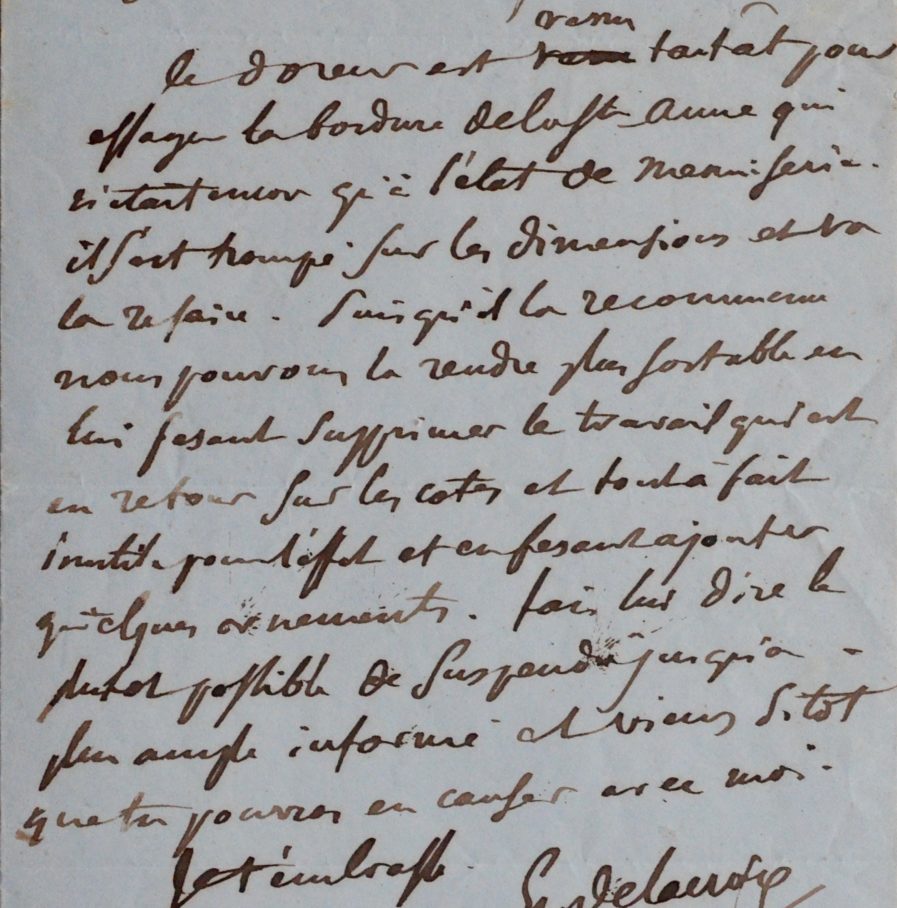 "Cher Maurice, le doreur est venu tantôt pour essayer la bordure de la Sainte-Anne qui n'était encore qu'à l'état de menuiserie. Il s'est trompé sur les dimensions et va la refaire. Puisqu'il la recommence nous pouvons la rendre plus sortable en lui fesant [sic] supprimer le travail qui est en retour sur les cotés et tout à fait inutile pour l'effet et en fesant [sic] ajouter quelques ornements. Fais lui dire le plutôt possible de suspendre jusqu'à plus ample informé et viens sitôt que tu pourras en causer avec moi. Je t'embrasse. Euh. Delacroix". Il ajoute en P.S. "Crie ton nom à travers la porte quand tu viendras à l'atelier".