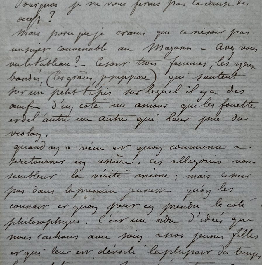 "Pourquoi je ne vous ferais pas la danse des oeufs ? Mais parce que je crains que ce ne soit pas un sujet convenable au Magasin. Avez-vous vu le tableau ? Ce sont trois femmes, les yeux bandés, (les grâces je suppose) qui sautent sur un petit tapis sur lequel il y a des oeufs, d'un côté un amour qui les fouette et de l'autre un autre qui leur joue du violon. Quand on a vécu et qu'on commence à se retourner en arrière, ces allégories vous semblent la vérité même [...] c'est un ordre d'idée que nous cachons avec soin à nos jeunes filles et qui leur est dévoilé la plupart du temps bien subitement et sans précaution. Ce qui doit être cause de bien des confusions, tristesses et mauvais ménages ; mais c'est aller bien loin à propos d'un petit dessin [...]".
