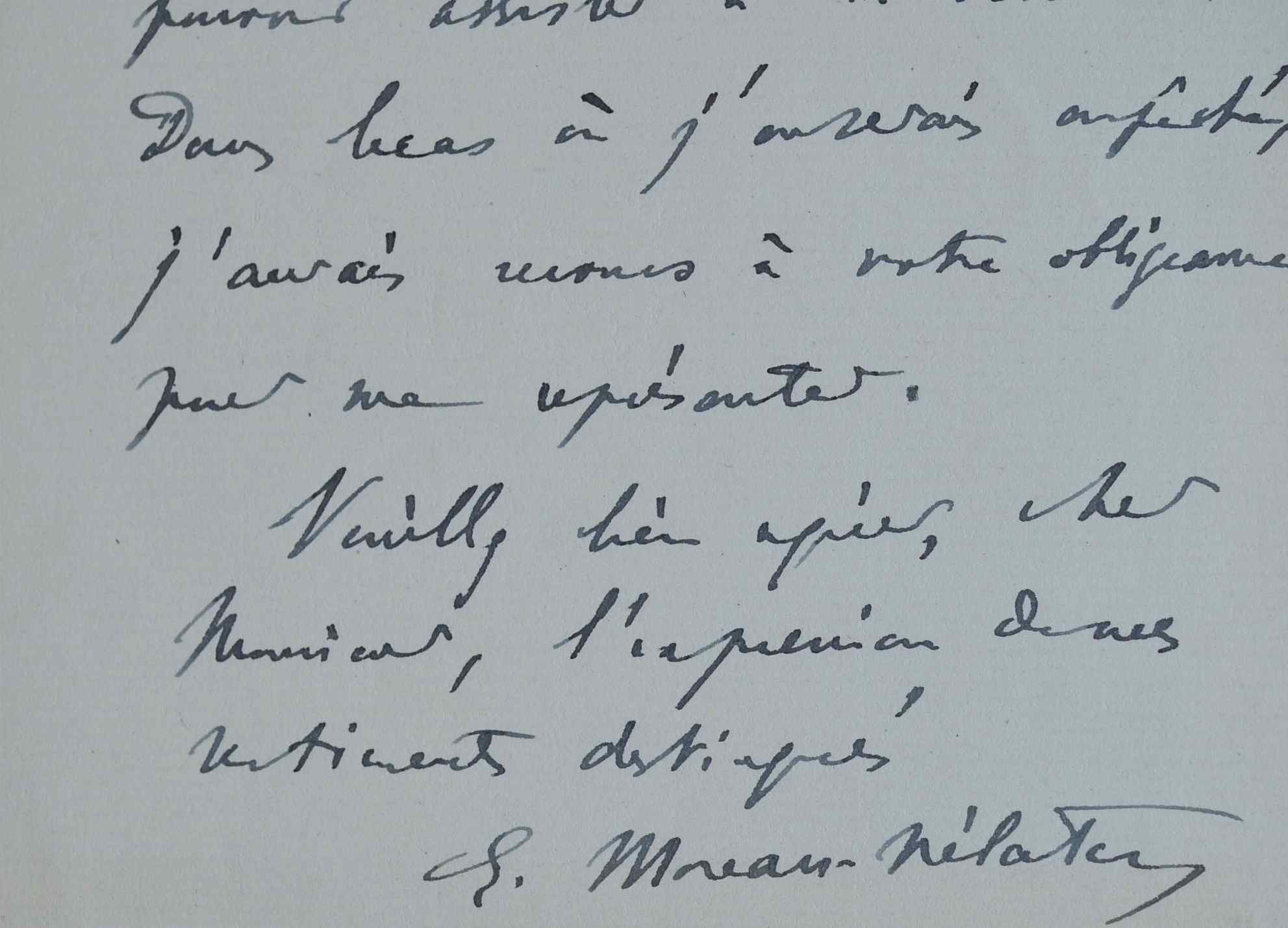 Dans cette lettre, l'historien de l'art Eugène Moreau-Nélaton espère pouvoir assister à une vente d'autographes : «Je vous remercie du renseignement que vous voulez bien me donner. Je savais, en effet, que les lettres en question allaient passer en vente sous peu. J'espère pouvoir assister à la vente. Dans le cas où je serais empêché, j'aurais recours à votre obligeance pour me représenter.» [A cette époque, Moreau-Nélaton achevait une biographie critique de Camille Corot (Paris, 1913). Il était également le spécialiste d'Eugène Delacroix].