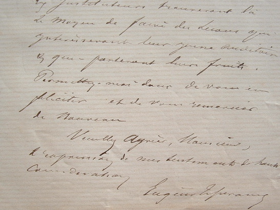 Eugène Tisserand voit, dans l'ouvrage que son correspondant lui a envoyé, le moyen de promouvoir l'enseignement agricole. «Vous faites une bonne oeuvre de pousser à la connaissance des insectes utiles. Les instituteurs trouveront là le moyen de faire des leçons qui intéresseront leur jeune auditoire et qui porteront leurs fruits [...]». [Henri Miot avait publié, en 1870, Les insectes auxiliaires et les insectes utiles].