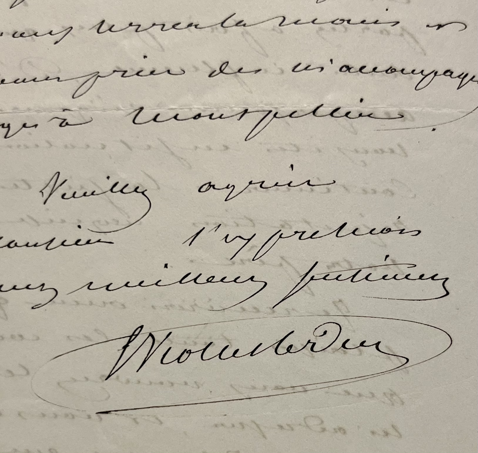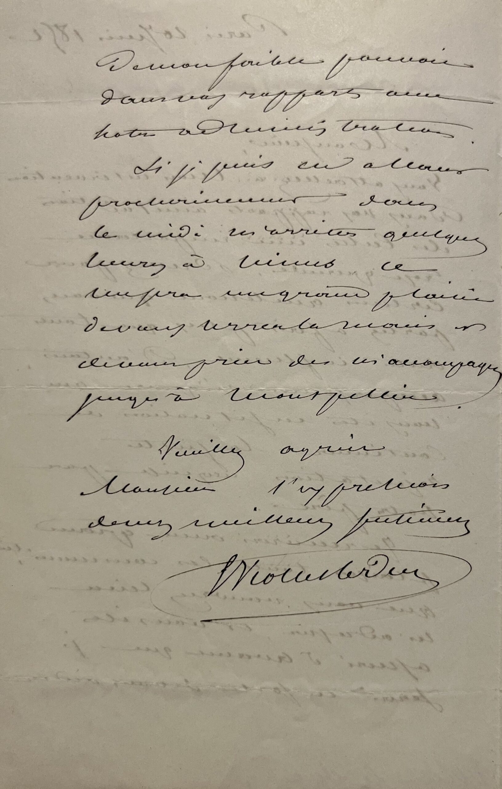 Si je puis en allant prochainement dans le Midi m’arrêter quelques heures à Nîmes ce me fera un grand plaisir de vous serrer la main et de vous prier de m’accompagner jusqu’à Montpellier".