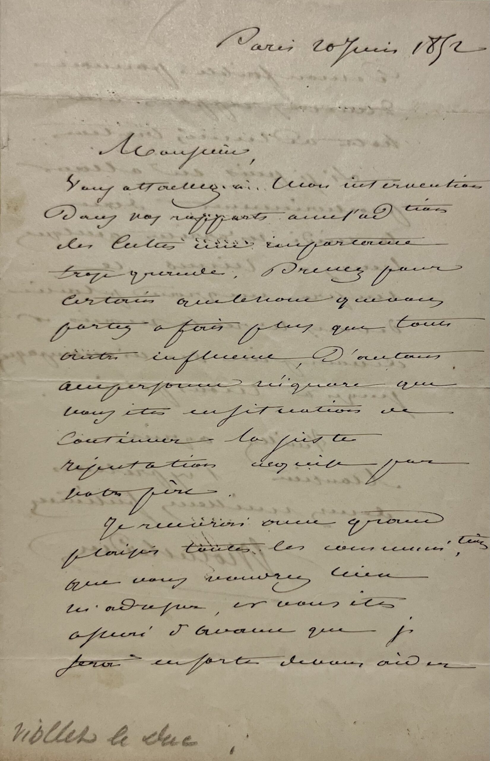 Vous attachez à mon intervention dans vos rapports avec l’ad[ministra]tion des cultes une importance trop grande. Prenez pour certain que le nom que vous portez a fait plus que tout autre influence. D'autant que personne n'ignore que vous êtes en situation de continuer la juste réputation, acquise par votre père.