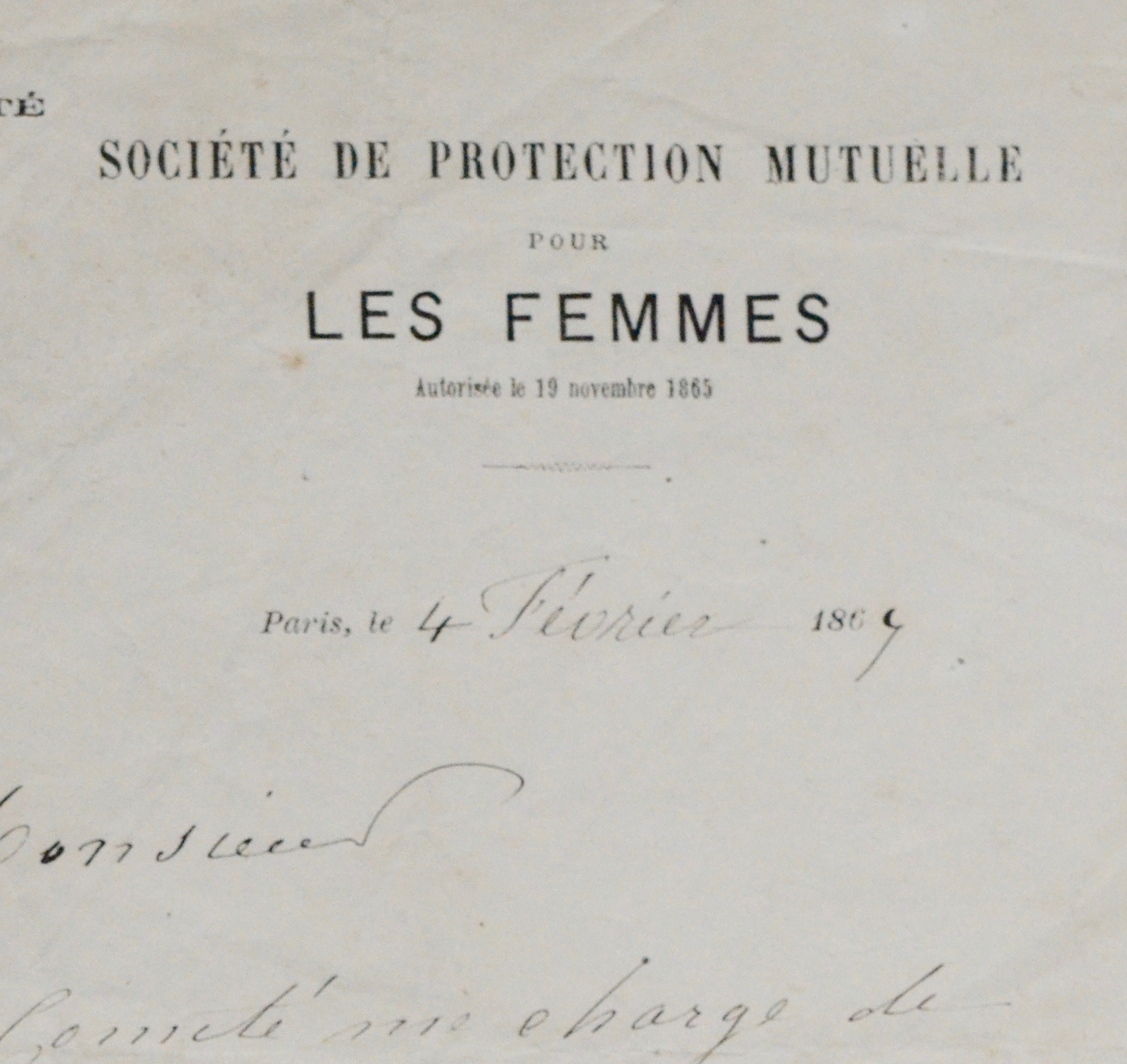Encre brune sur feuillet double. En-tête imprimé "Société de protection mutuelle pour les Femmes - Siège de la société".