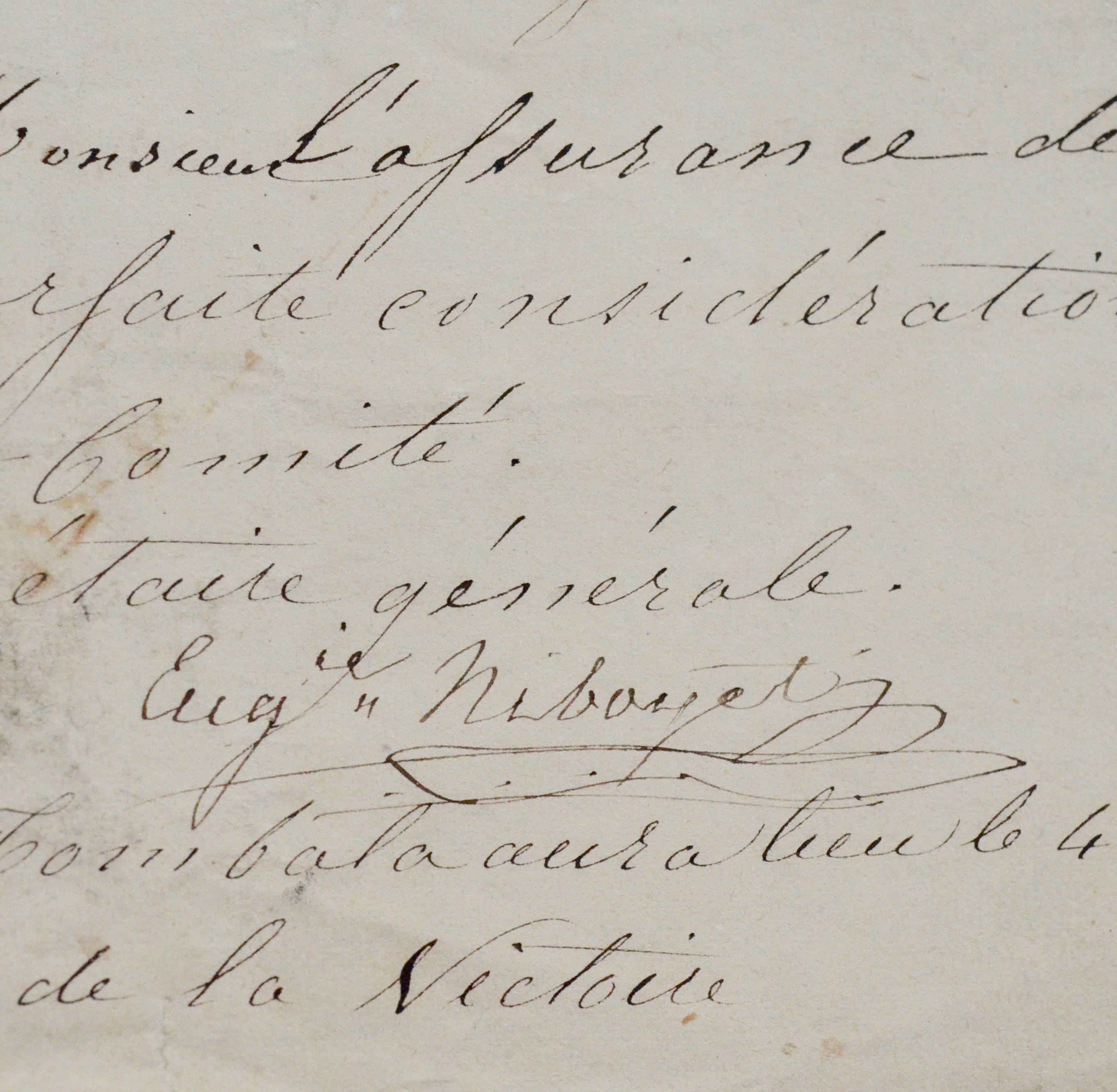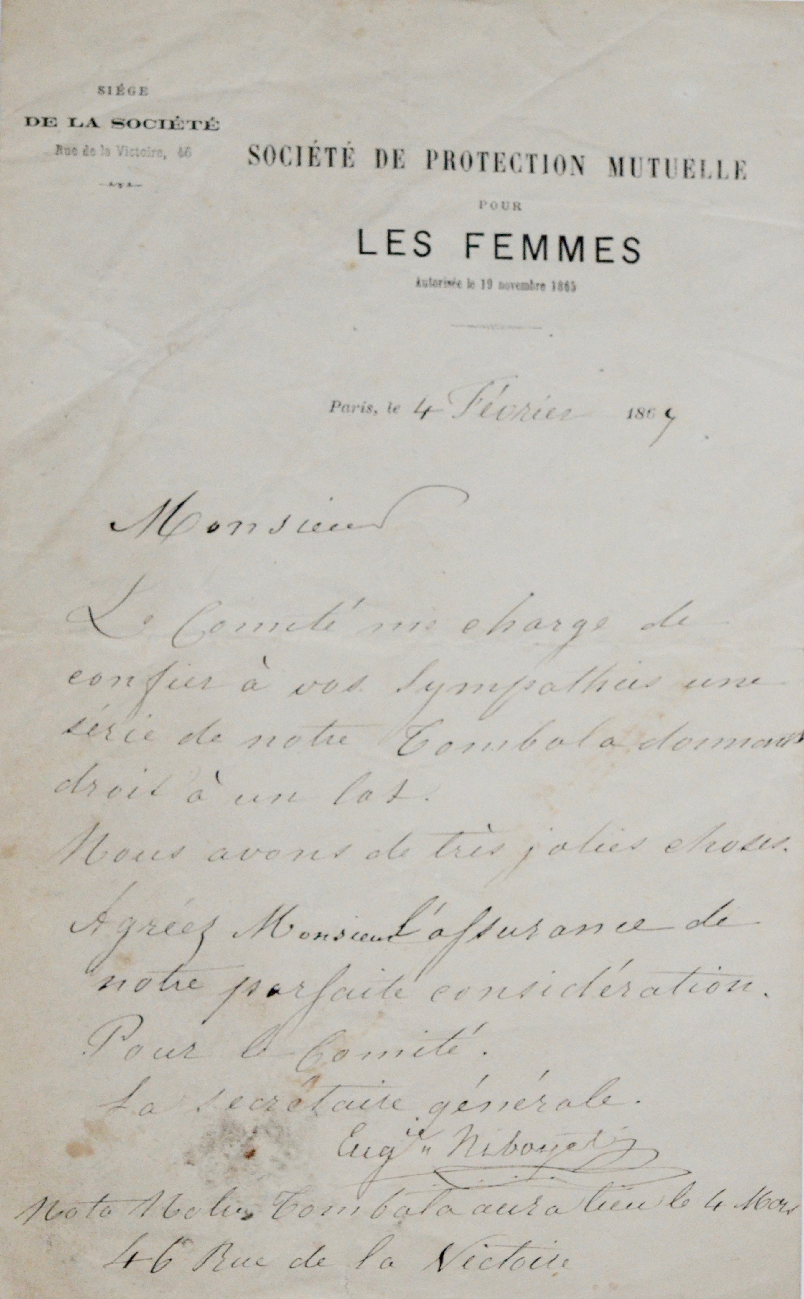 Lettre d'Eugénie Niboyet, secrétaire générale de la Société de protection mutuelle pour les Femmes.
