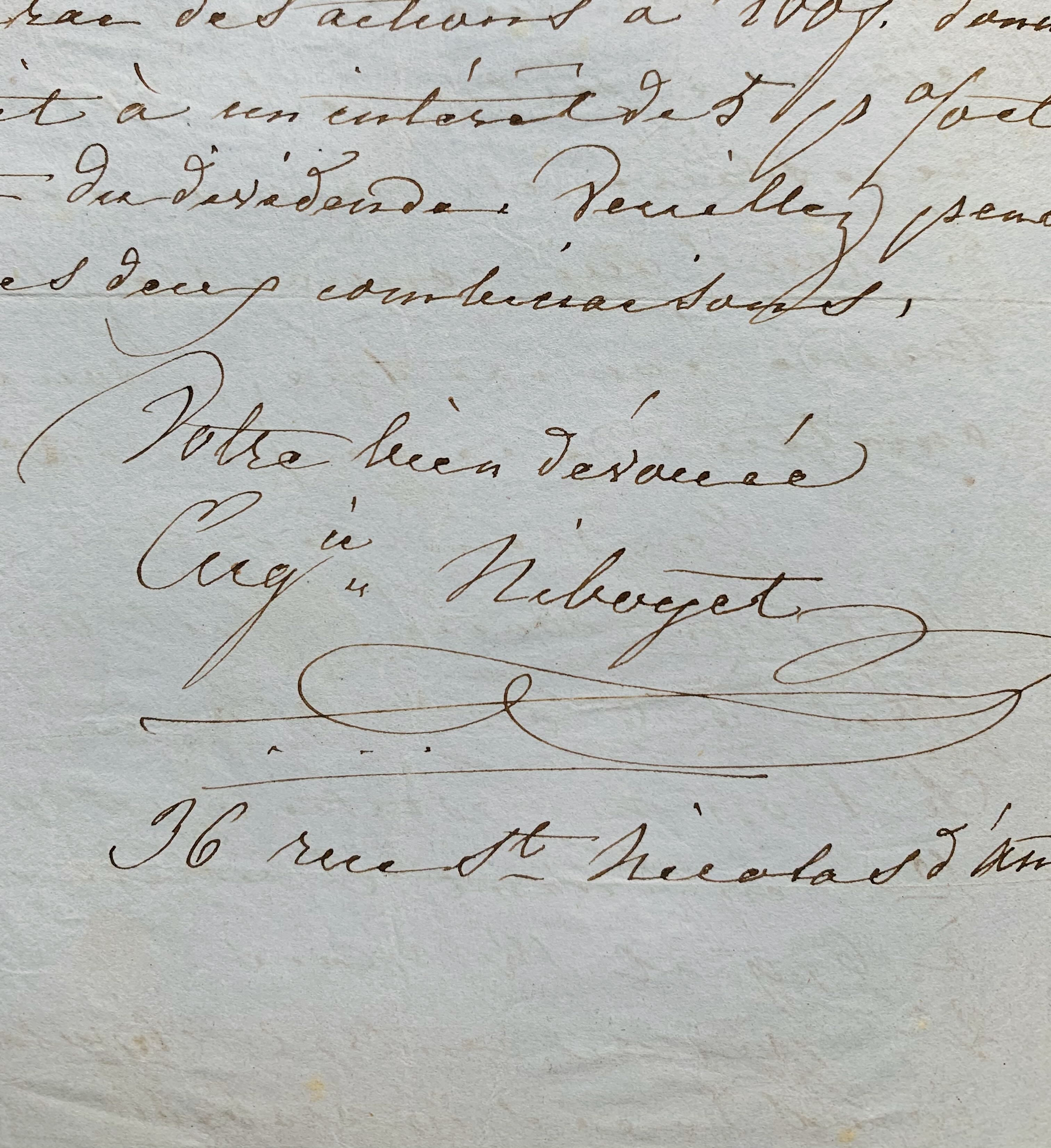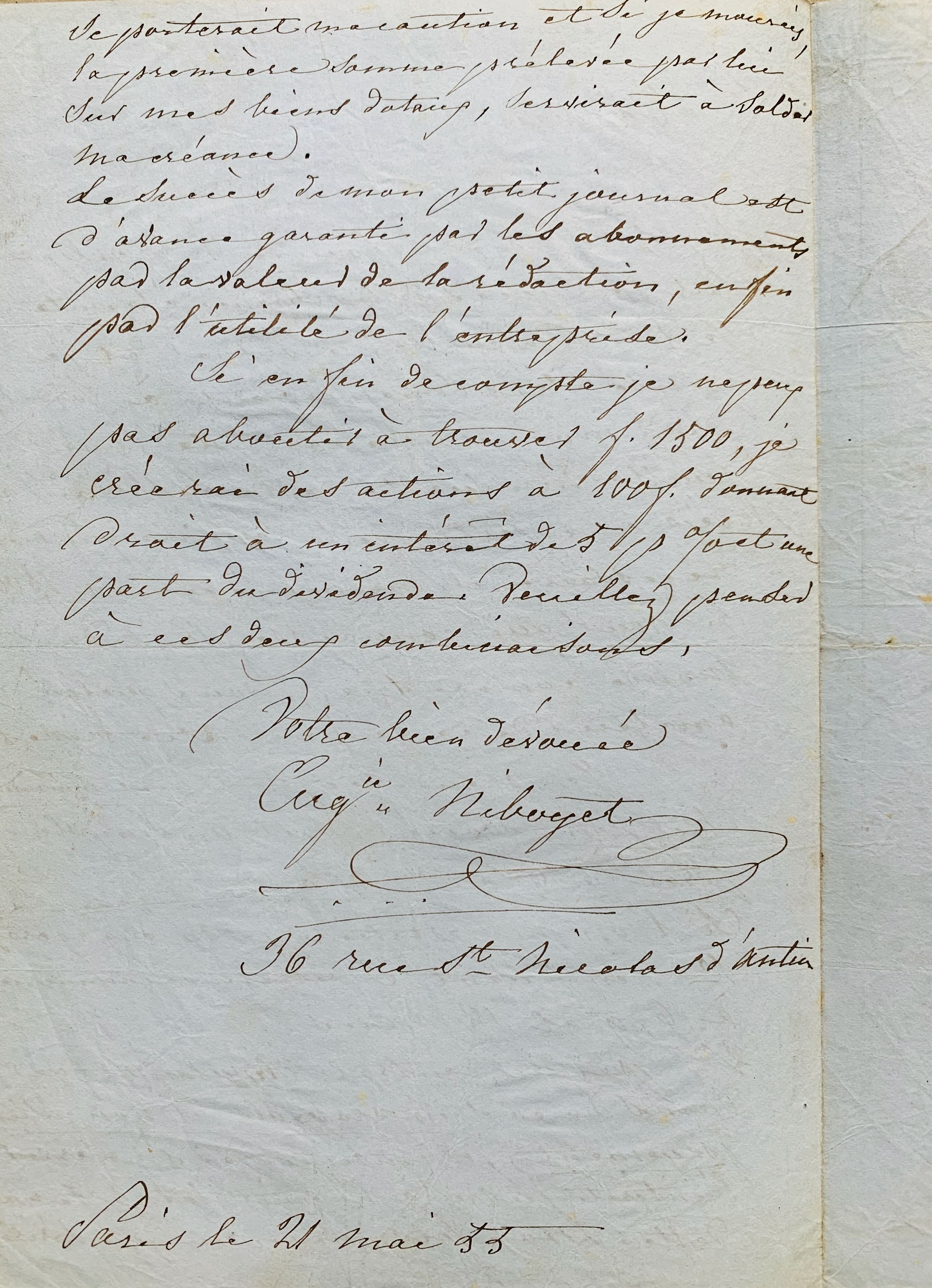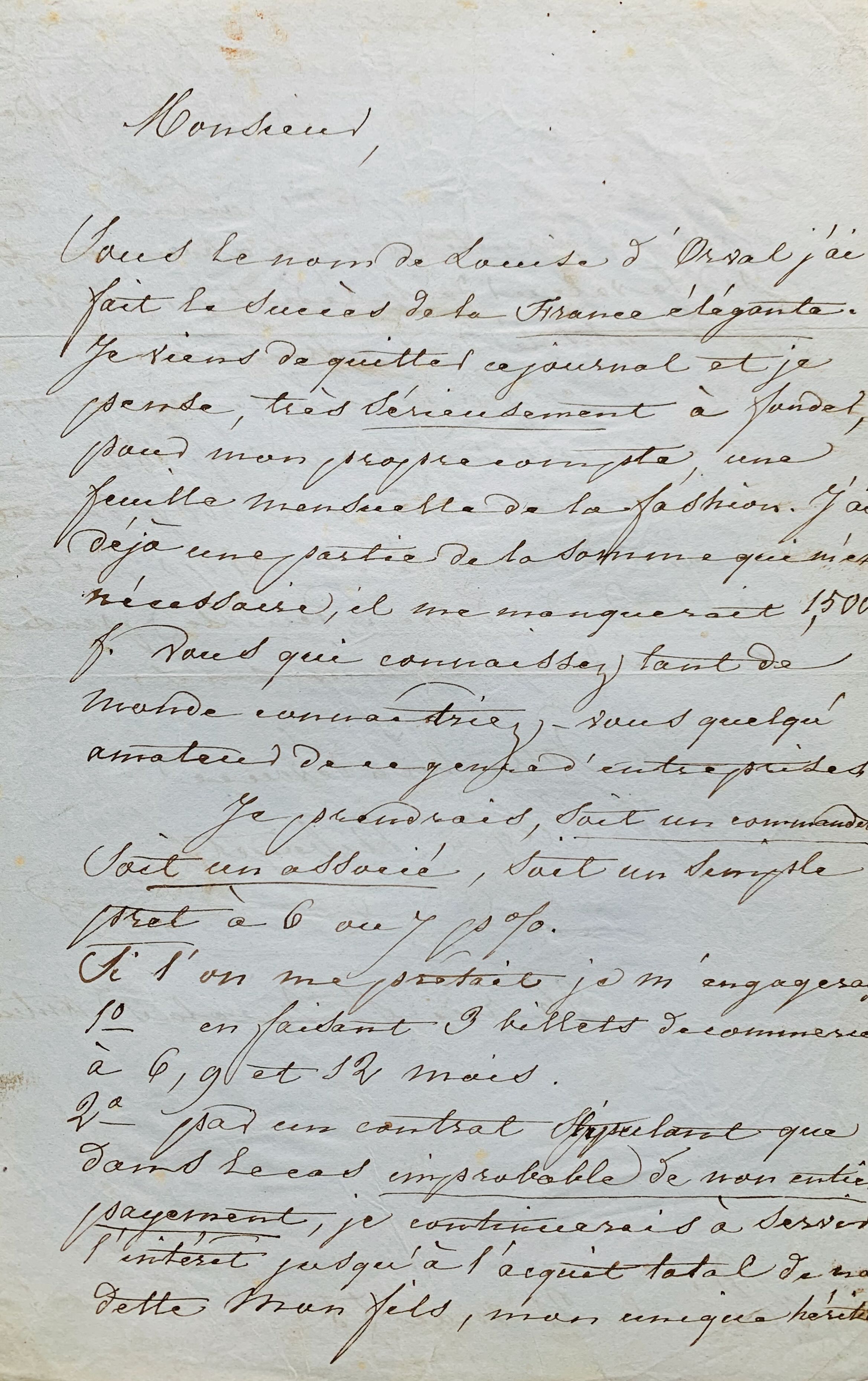 "Sous le nom de Louise d'Orval, j'ai fait le succès de la France élégante. Je viens de quitter ce journal et je pense très sérieusement à fonder, pour mon propre compte, une feuille mensuelle de la fashion. J'ai déjà une partie de la somme qui m'est nécessaire, il me manquerait 1,500 f. Vous qui connaissez tant de monde, connaitriez-vous quelqu'amateur de ce genre d'entreprises? Je prendrais soit un commanditaire, soit un associé, soit un simple prêt à 6 ou 7 %. Si l'on me prêtait, je m'engagerais 1° en faisant 3 billets de commerce à 6, 9 et 12 mois. 2° par un contrat stipulant que dans le cas improbable de non entier payement, je continuerais à servir l'intérêt jusqu'à l'acquit total de ma dette ; mon fils, mon unique héritier, se porterait en caution et si je mourais, la première somme prélevée par lui sur mes biens dotaux, servirait à solder ma créance. Le succès de mon petit journal est d'avance garanti par les abonnements, par la valeur de la rédaction, enfin par l'utilité de l'entreprise [...]".