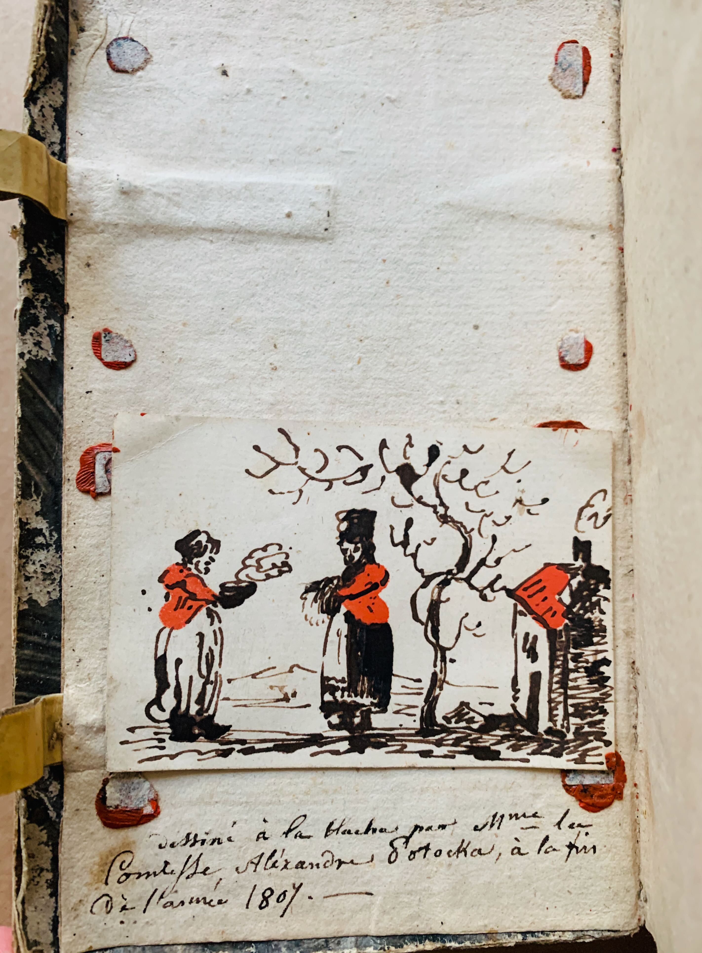 Débuté à Tilsit en juin et juillet 1807, ce journal donne un tableau des pertes subies par les Russes et les Prussiens dans la campagne de Pologne (pp. 8-9) et donne copie de certaines dispositions du traité conclu le 7 juillet à Tilsit entre Napoléon Ier et le tsar Alexandre Ier. Il se poursuit en Pologne de juillet à septembre 1808, alors qu'Anatole de Montesquiou servait auprès du maréchal Davout, gouverneur du pays, notamment à Breslau (Wrocław), à Skierniewice (château du maréchal Davout près de Varsovie) et à Młociny (maison du même près de Varsovie, occupée après l'incendie de Skierniewice). On y trouve des allusions à des personnalités polonaises fréquentées à cette époque : le général Włodzimierz Potocki, la comtesse Potocka, Anna Tyszkiewicz, épouse du chambellan de Napoléon Ier, Aleksander Potocki (dont Anatole de Montesquiou a gardé ici un dessin qu'elle lui a tracé au verso d'une carte à jouer, fixé par 4 points de cire en page de garde), et surtout la princesse Radziwill dont il brosse un admiratif et long portrait (« une des femmes les plus extraordinaires que j'ai vues », pp. 93-96). Avec un texte en polonais et des notes sur la grammaire de cette langue. Suit le récit de son voyage de Pologne à Paris, de septembre 1808 à janvier 1809 (pp. 65-93 et 96-98), passant par Wrocław, Berlin, notamment au château de Charlottenburg, et Erfurt.