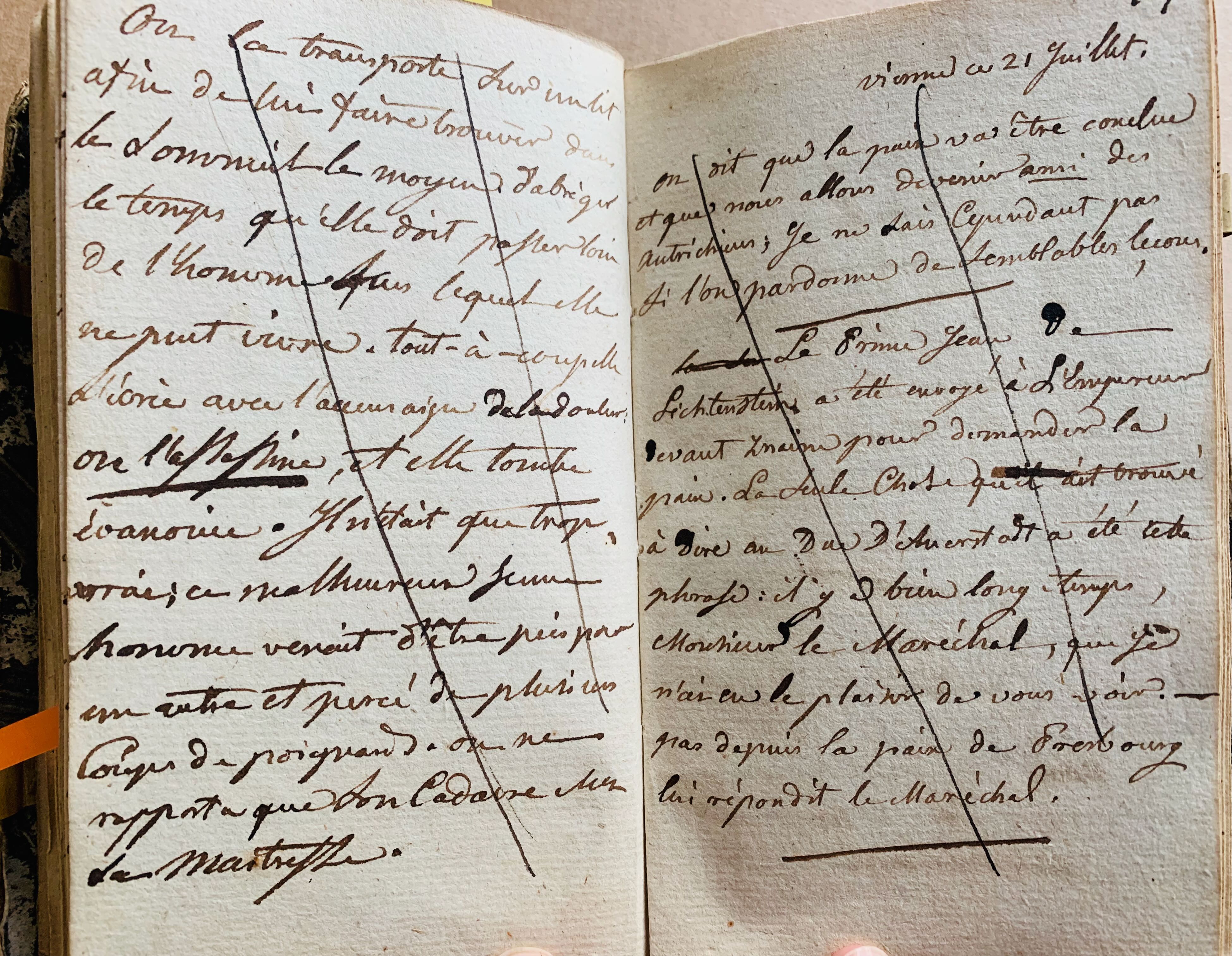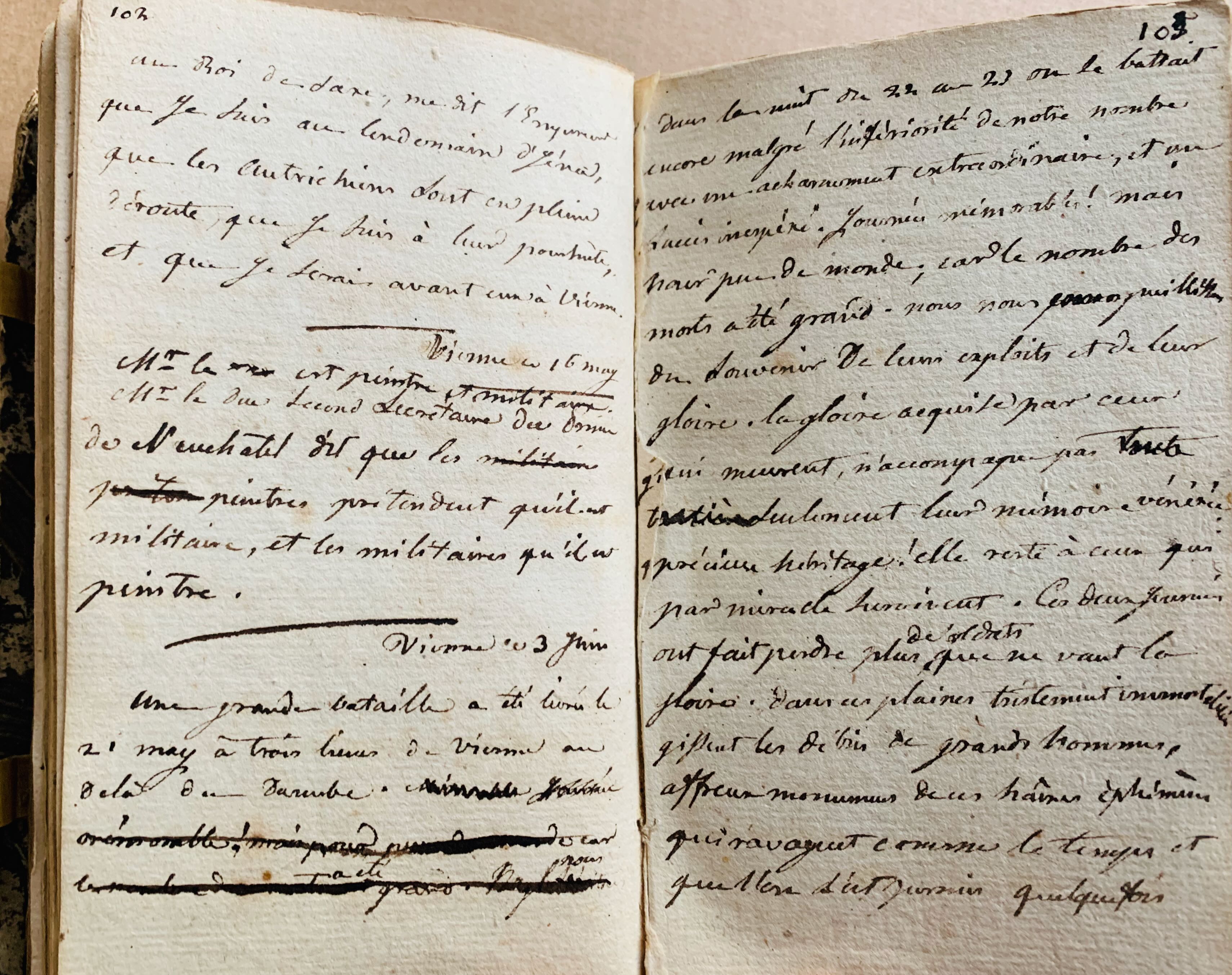 Le journal, un temps interrompu, reprend lors de la campagne d'Autriche, à Vienne et au château de Schönbrunn, du 15 mai au 26 septembre 1809 (pp. 101-120) : Anatole de Montesquiou consigne deux missions qu'il remplit alors pour Napoléon Ier, l'une auprès du roi de Saxe, l'autre auprès du prince Eugène, et il annonce la nouvelle de la bataille d'ESSLING (« Une grande bataille a été livrée le 21 may à trois lieues de Vienne au-delà du Danube [...]. Dans la nuit du 22 au 23, on se battait encore malgré l'infériorité de notre nombre avec un acharnement extraordinaire, et un succès inespéré. Journée mémorable mais pour peu de monde ; car le nombre des morts a été grand. Nous nous (?) du souvenir de leurs exploits et de leur gloire. La gloire acquise par ceux qui meurent, n'accompagne pas seulement leur mémoire vénérée, précieux héritage! elle reste à ceux qui par miracle survivent. Ces deux journées ont fait perdre plus de soldats que ne vaut la gloire. Dans ces plaines tristement immortalisées gisent les débris de grands hommes , affreux monuments de ces haines éphémères qui ravagent comme le temps que l'on s'est juré quelquefois d'appeler éternelles. On en perdra les traces un jour, et jusqu'au moindre souvenir en deviendra ignoré ». Vienne 5 juin 1809. "Je viens d'être envoyé par l'Empereur à Bruck en Styrie au Prince vice-roi qui vient de faire la jonction avec la grande armée [...]. Vienne 21 juillet : "On dit que la paix va être conclue et que nous allons devenir amis des Autrichiens ; je ne sais cependant pas si l'on pardonne de semblables leçons".