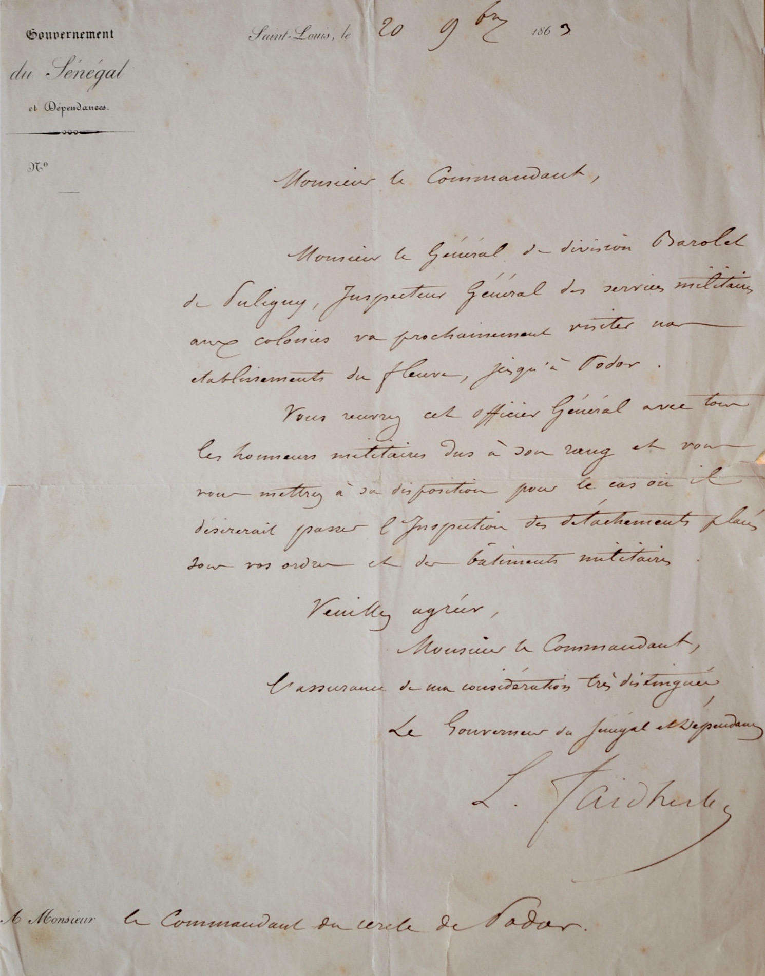 Lettre de Faidherbe, adressée au militaire en charge des troupes et infrastructures de la ville de Podor, au Sénégal :