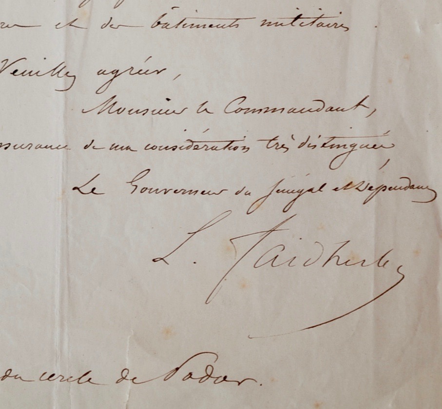 Veuillez agréer, Monsieur le Commandant l'assurance de ma considération très distinguée. Le Gouverneur du Sénégal et dépendances [...]".